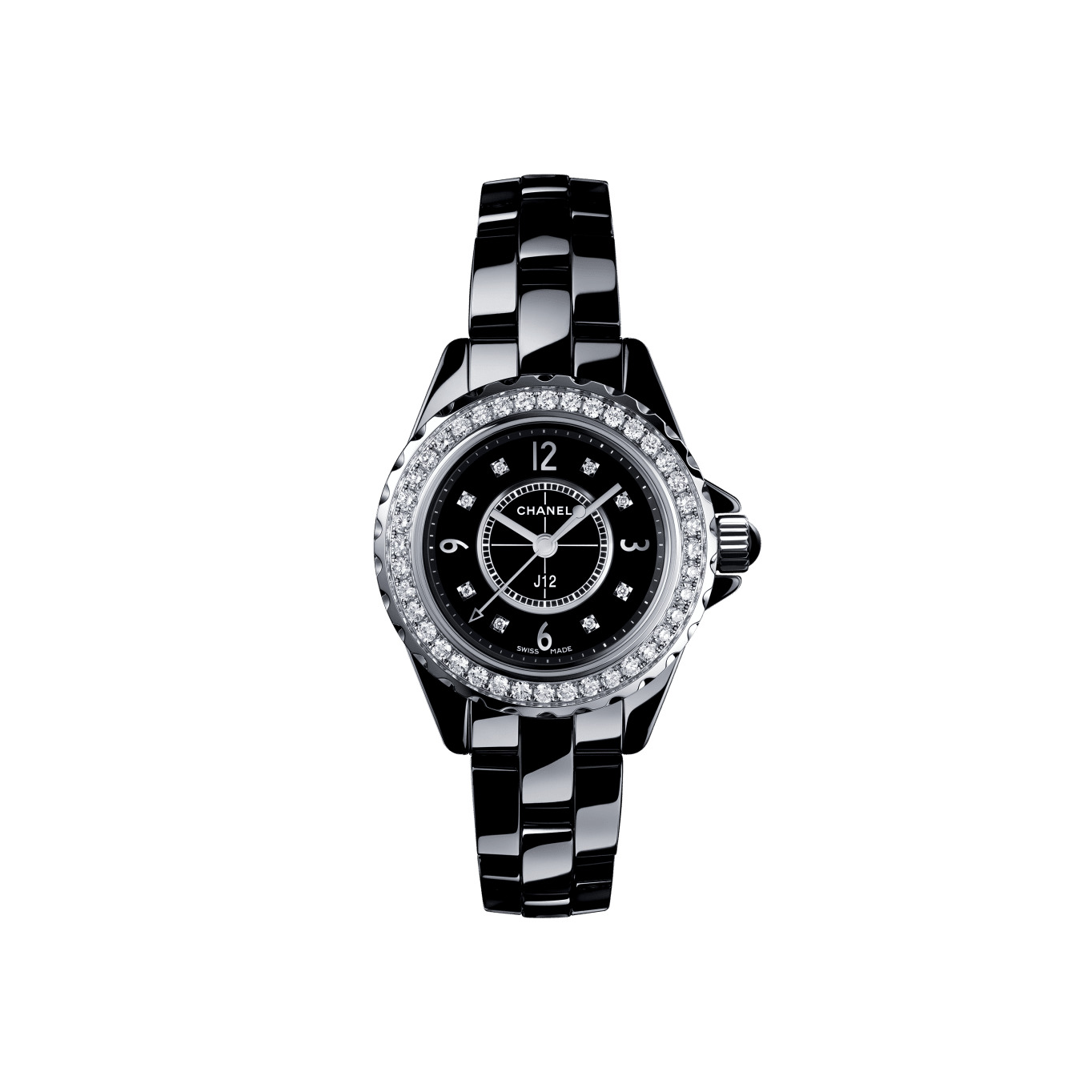 J12 Watch, 29 mm, Black highly resistant ceramic and steel, diamond bezel and indicators on the CHANEL website. Black highly resistant ceramic and steel, diamond bezel and indicators