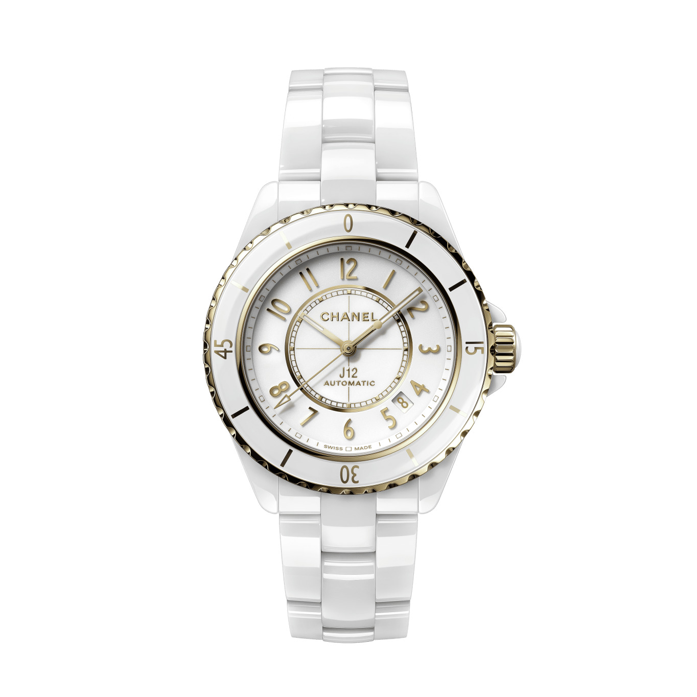 J12 Watch Caliber 12.1, 38 MM, White highly resistant ceramic and 18K yellow gold on the CHANEL website. White highly resistant ceramic and 18K yellow gold