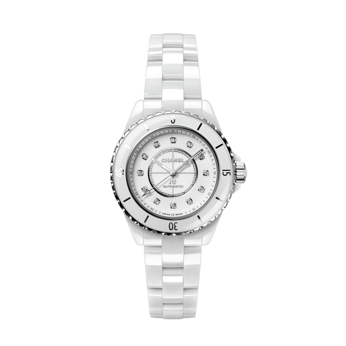 J12 Watch Caliber 12.2, 33 MM, White highly resistant ceramic and steel, diamond indicators on the CHANEL website. White highly resistant ceramic and steel, diamond indicators