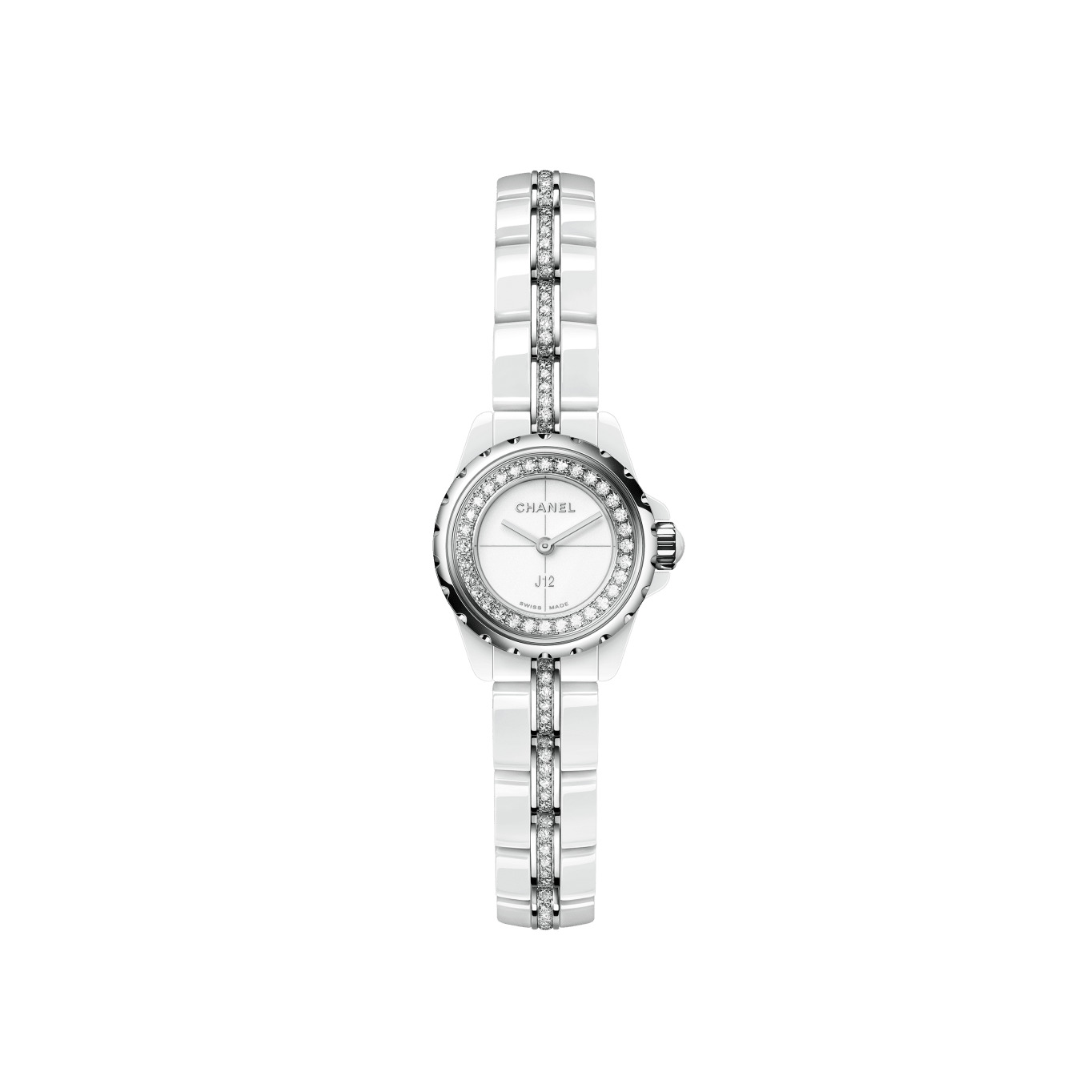 J12∙XS Watch, 19 mm, White highly resistant ceramic and steel, diamond flange and bracelet on the CHANEL website. White highly resistant ceramic and steel, diamond flange and bracelet