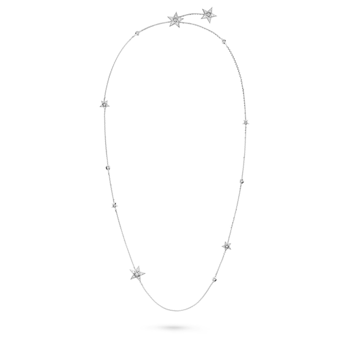 Les infinis de Comète, Transformable long necklace, 18K white gold, diamonds on the CHANEL website. Transformable long necklace, 18K white gold, diamonds