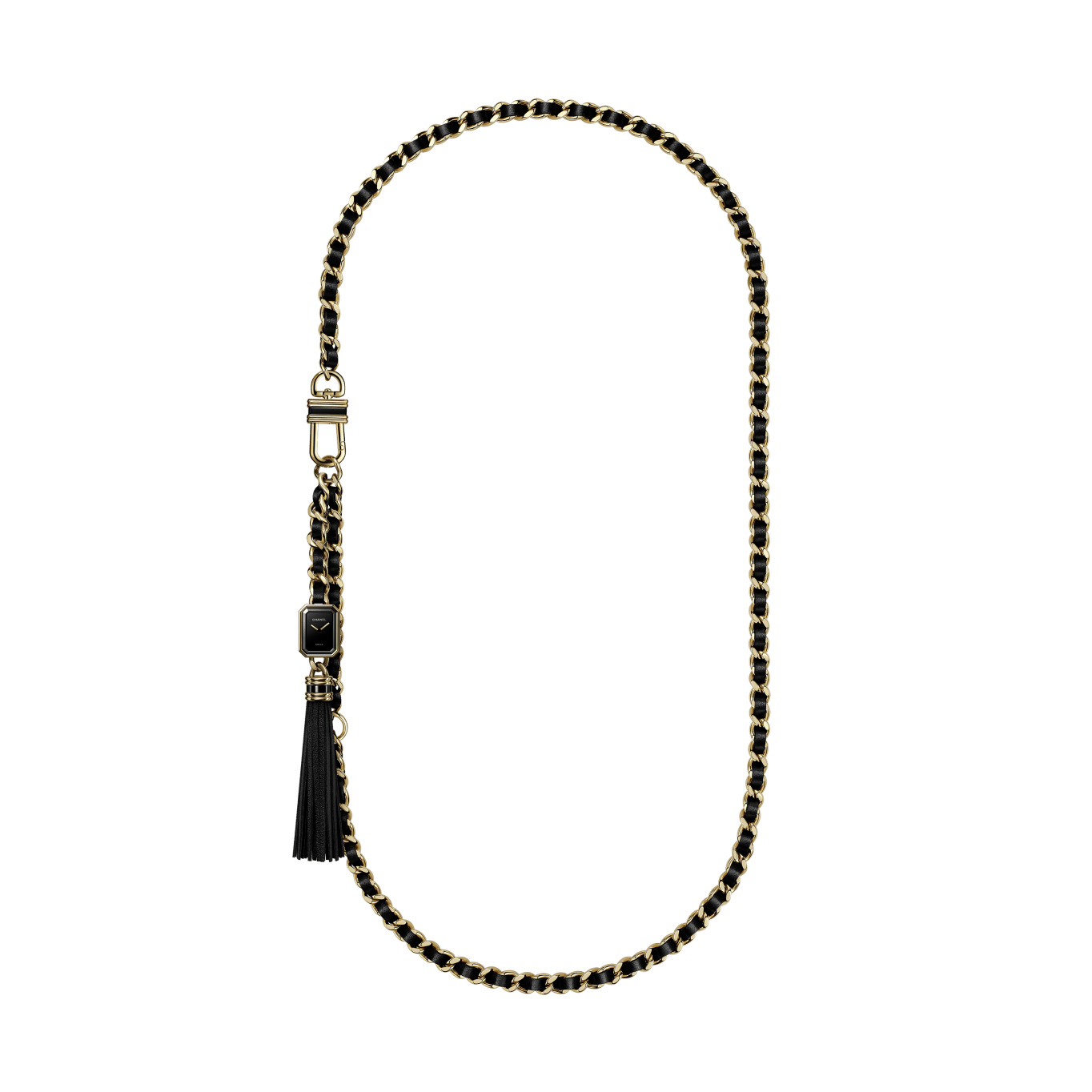 PREMIERE SAUTOIR-BELT WATCH, Steel coated with yellow gold (0.1 micron) and black leather, black-lacquered dial on the CHANEL website. Steel coated with yellow gold (0.1 micron) and black leather, black-lacquered dial