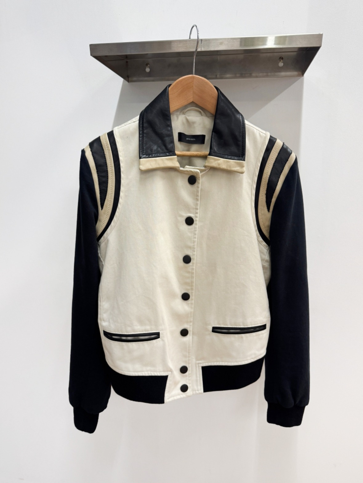 어깨 : 40cm 가슴 : 45cm 팔길이 : 59cm 총장 : 55cm ( 여성 S 정도의 사이즈 ) 원본보기 Diesel Cotton & Leather Jacket 1.Cotton & Faux Leather Fabric. 2 .베이직한 무드의 제품으로 깔끔하고 미니멀한 무드의 착장에 활용 해 보세요 ! 3.오염 및 결함 없는 우수한 컨디션의 제품 입니다.