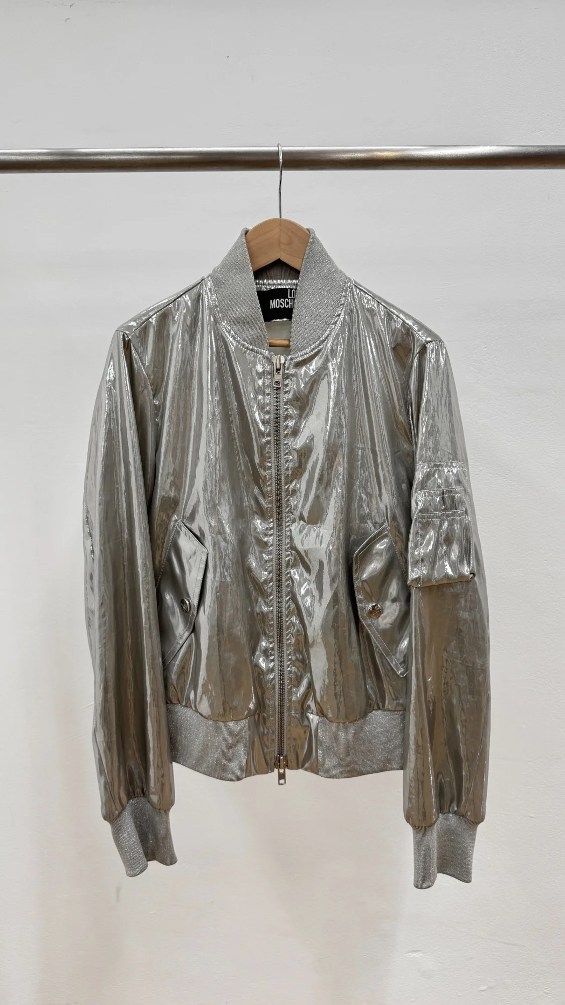 어깨 : 42cm 가슴 : 46cm 팔길이 : 62cm 총장 : 66cm ( 여성 S 정도의 사이즈 ) 원본보기 Moschino Silver Bomber 1.Cotton & Acetate Fabric. 2.오염 및 결함 없는 우수한 컨디션의 제품 입니다. 3.얇은 두께감으로 요즘의 날씨에 포인트로 활용 해 보세요 !