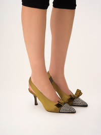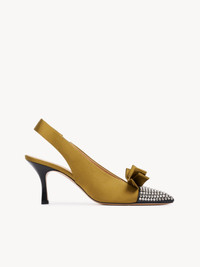 DESCRIPTION Crafted from lower-impact satin, these Alba slingback pumps pair a tonal bow with a contrasting pointed toe finished with strass. The elasticated padded ankle strap ensures a comfortable fit. PRODUCT DETAILS Pump heel height: 3" (7.5 cm) Heel-to-toe drop: 3" (7.5 cm) Upper: 72% viscose, 28% silk Inner sole: lambskin Main lining: lambskin Sole: cowhide Heel: cowhide Fit true to size, European sizing - Slip-on Color: Gold Khaki Item code: CH26S16JWM21B CARE INSTRUCTIONS This item is crafted in a fine and delicate material. We recommend you take special care when wearing jewelry or accessories that may catch or pull the fabric to keep its quality intact.