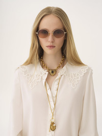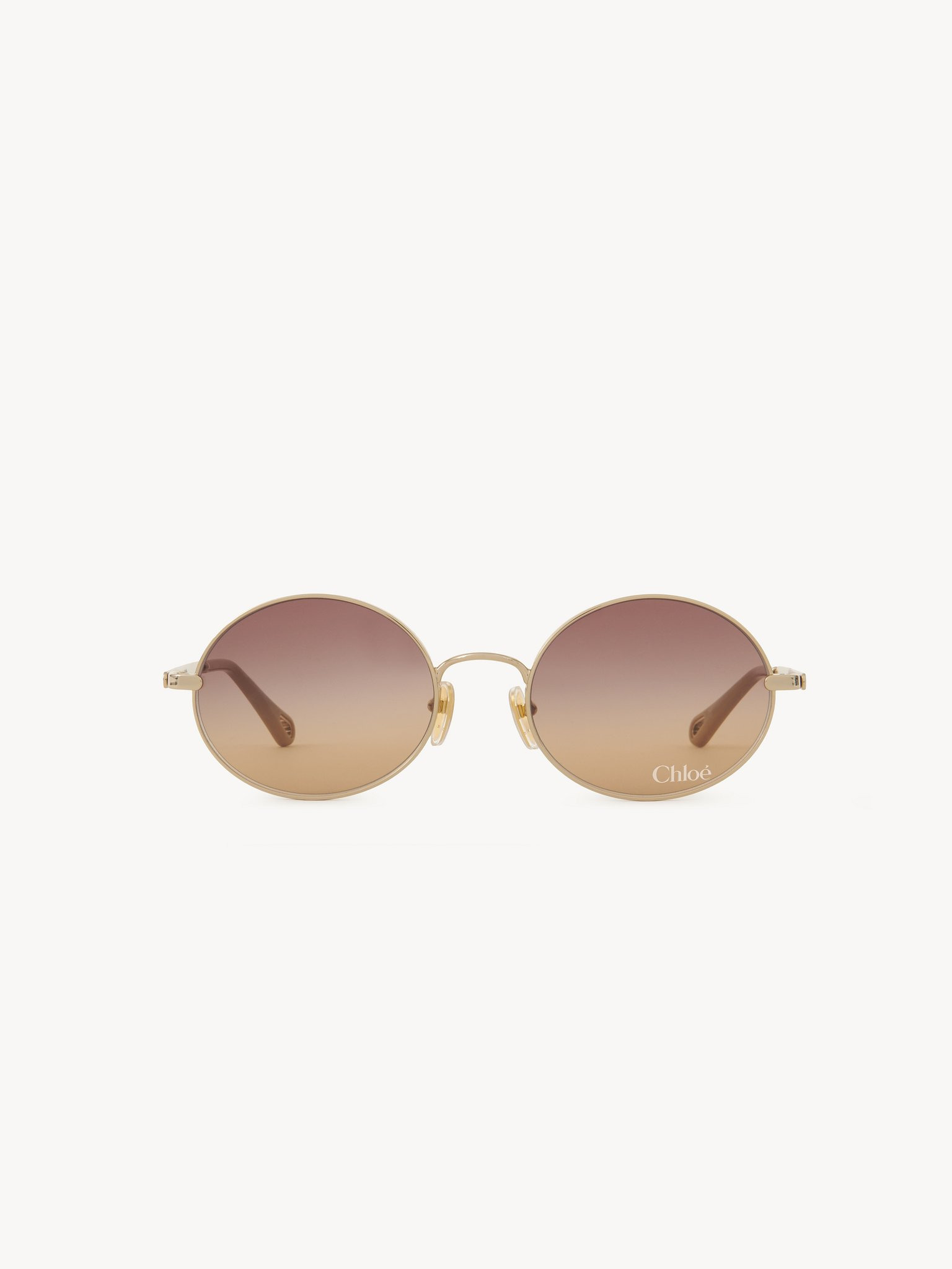 These small Aly oval sunglasses pair a lightweight frame in shiny gold-tone metal with triple gradient brown lenses. The Chloe logo finishes the left lens and temples. Drop-shaped openings at the temple tips make these sunglasses compatible with Chloe's eyewear jewelry. PRODUCT DETAILS Oval sunglasses in gold metal & bio-based nylon - 100% UVA and UVB protection - Adjustable nose pads - Prescription friendly - Chloe logo engraved on the temples - Filter category: 2 These sunglasses come with a case and lens cloth - Lens: 2.2" (55 mm) - Bridge: 0.8" (20 mm) - Temple: 5.5" (140 mm) - Gold metal frame - Gradient brown lenses Item code: CH25WEK0326742