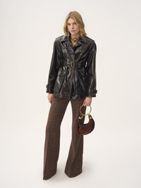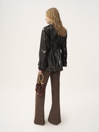 Belted jacket in shiny coated cotton, featuring maxi flap pockets, engraved horn buttons and gold-tone hardware. PRODUCT DETAILS Belted jacket outer shell: 100% Cotton Lining: 62% Viscose, 38% Cotton Buttons: 100% Water buffalo horn Fit: straight - The model is 5'10" (178 cm) and wears a prototype in size 36 - Utilitarian jacket - Engraved horn buttons through front, at cuffs & at shoulders - Maxi front flap pockets with top & side entry - Gold metal Chloe logo triangle at left pocket - Shoulder and cuff tabs - Gold-tone hardware at chest Color: Black Item code: CH25AVE15947001