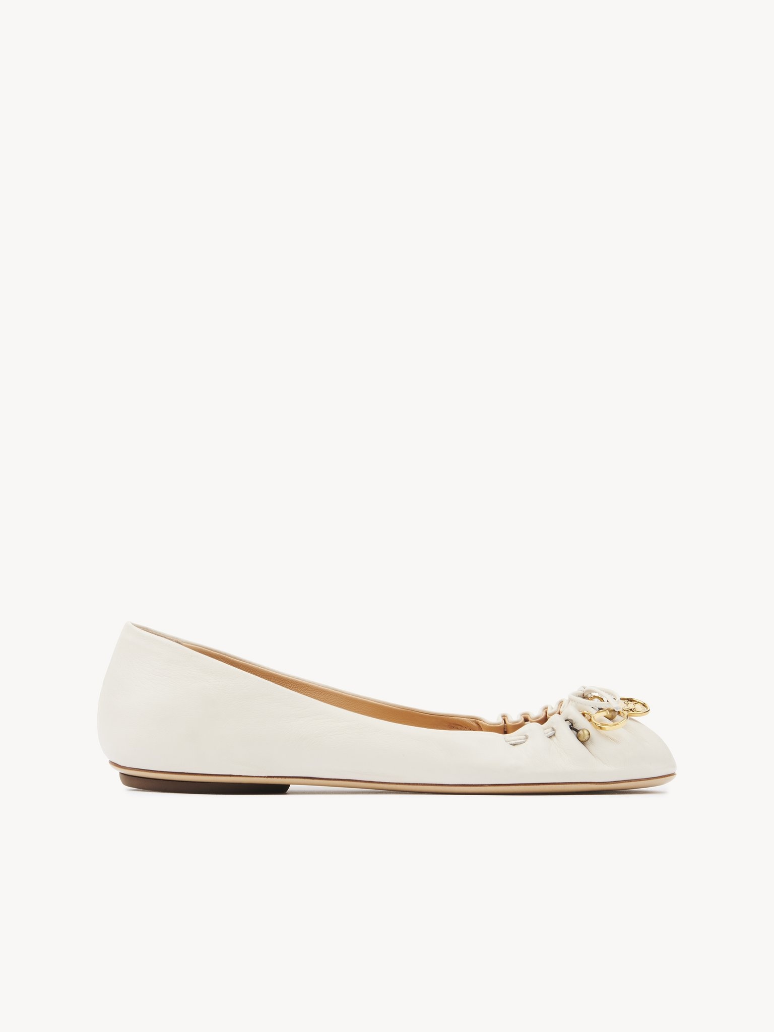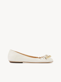 Crafted from nappa lambskin, the Chloe Charms ballerinas combine an almond toe shape with a pleated front, tonal bow embellishment and gold-tone charms inspired by the Maison's heritage. PRODUCT DETAILS Flat ballerina Upper: lambskin Inner sole: lambskin Main lining: lambskin Sole: cowhide Fit true to size, European sizing - Slip-on To make this product, Chloe worked with Leather Working Group (LWG) certified leather manufacturers. LWG certifies tanneries based on their water and energy usage, management of chemicals, solid waste, and wastewater. Color: Eggshell Item code: CH25A11TRI122