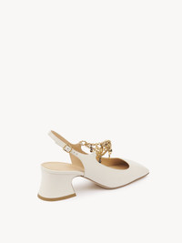 Crafted from nappa lambskin, the Chloe Charms slingback pumps combine a flared block heel with an adjustable buckled ankle strap. A gold-tone chain embellishes the foot with Chloe Charms inspired by the Maison's heritage. PRODUCT DETAILS Slingback pump heel height: 2.2" (5.5 cm) Heel-to-toe drop: 2.2" (5.5 cm) Upper: lambskin Inner sole: calfskin Main lining: calfskin Sole: cowhide Heel: lambskin Fit true to size, European sizing - Buckle fastening To make this product, Chloe worked with Leather Working Group (LWG) certified leather manufacturers. LWG certifies tanneries based on their water and energy usage, management of chemicals, solid waste, and wastewater. Color: Eggshell Item code: CH25A11VRI122