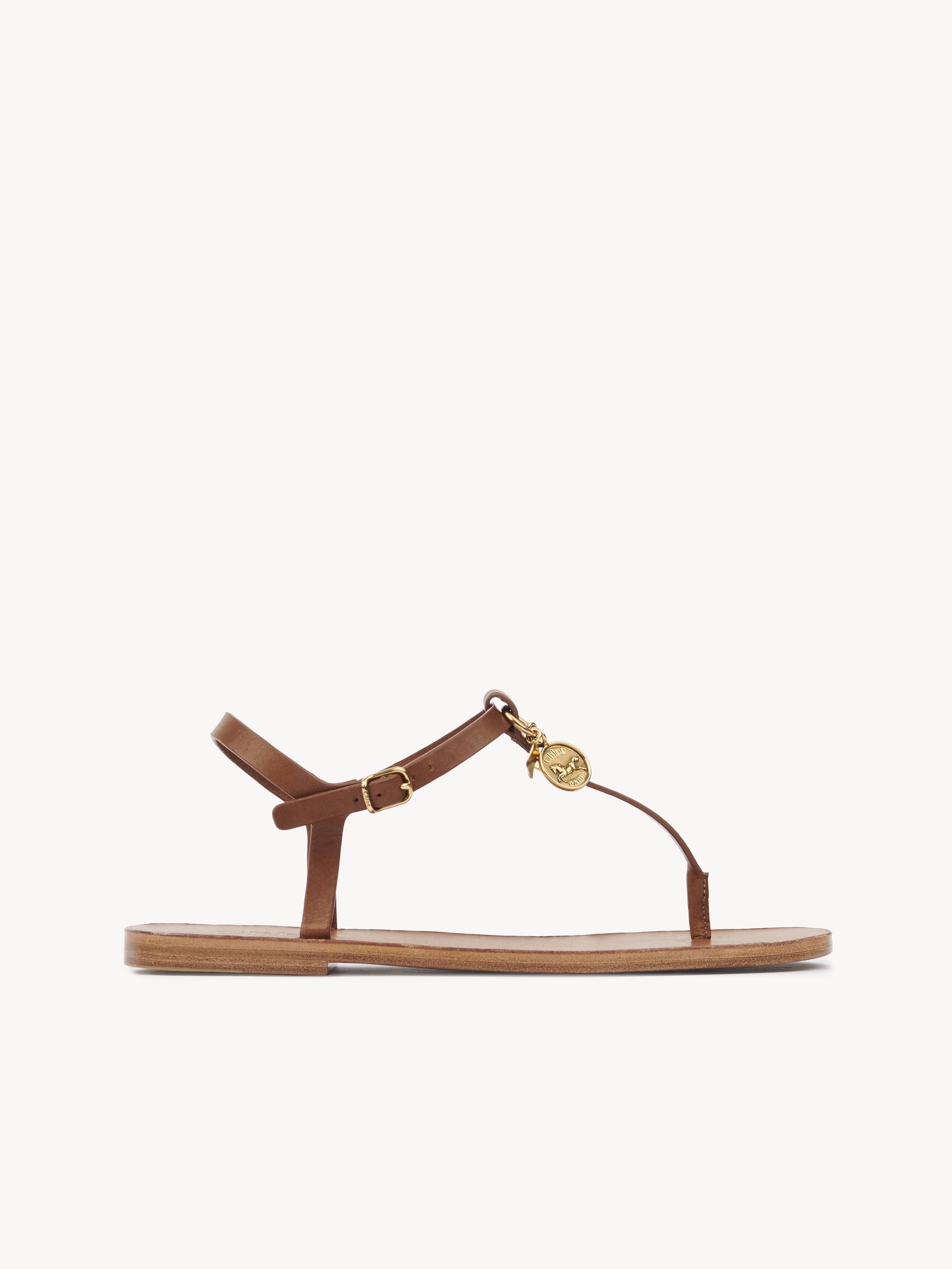 Crafted from shiny calfskin, the Chloe Charms flat sandals pair a delicate thong upper with an adjustable buckled ankle strap. The front is embellished with subtle gold-tone charms inspired by the Maison's heritage. PRODUCT DETAILS Flat sandal Upper: calfskin Inner sole: calfskin Main lining: calfskin Sole: cowhide Fit true to size, European sizing - Buckle fastening To make this product, Chloe worked with Leather Working Group (LWG) certified leather manufacturers. LWG certifies tanneries based on their water and energy usage, management of chemicals, solid waste, and wastewater. Color: Ginger Brown Item code: CHC25A12SLT27T