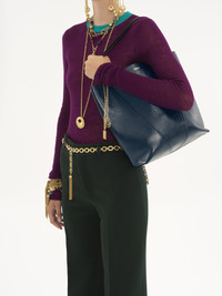 Crafted from shiny grained calfskin, the Chloe Spin tote bag has a minimalist silhouette elevated with graphic lines. A dangling chain features the Maison's signature Chloe and Horse Medals. Wear on the shoulder or slide the handles through the ring for relaxed hand carry. PRODUCT DETAILS Chloe Spin tote bag in shiny grained calfskin Main material: Cowhide Main lining: Cowhide Carry: Shoulder & hand - 1 main compartment Comes with a dust bag - Width: 10.6" (27 cm) - Height: 11.8" (30 cm) - Depth: 5.5" (14 cm) - Handle drop: 9.1" (23 cm) This tote bag is made from semi-aniline leather. The half-transparent finish imparts a robust nature to the product while preserving its natural character. Follow all care instructions on the insert. This Chloe Spin bag is made with unlined leather, so there may be slight marks inside the bag, such as veins or scratches. Color: Tapestry Blue Item code: CHC25SS811N8444Q