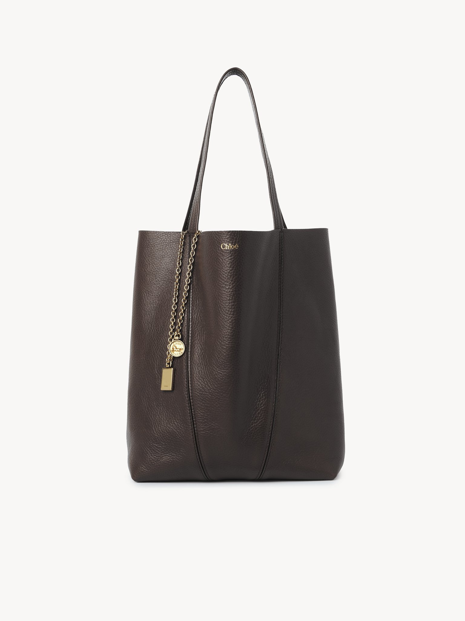 Crafted from shiny grained cowhide, the Chloe Spin tote bag has a minimalist silhouette elevated with graphic lines. A dangling chain features the Maison's signature Chloe and Horse Medals. Wear on the shoulder or slide the handles through the ring for hand carry. PRODUCT DETAILS Chloe Spin tote bag in shiny grained cowhide Main material: Cowhide Main lining: Cowhide Carry: Hand & shoulder - 1 main compartment Comes with a dust bag - Width: 10.6" (27 cm) - Height: 11.8" (30 cm) - Depth: 5.5" (14 cm) - Handle drop: 9.1" (23 cm) To make this product, Chloe worked with Leather Working Group (LWG) certified leather manufacturers. LWG certifies tanneries based on their water and energy usage, management of chemicals, solid waste, and wastewater. This Chloe Spin bag is made with unlined leather, so there may be slight marks inside the bag, such as veins or scratches. Color: Kohl Brown Item code: CHC25SS811N8424X