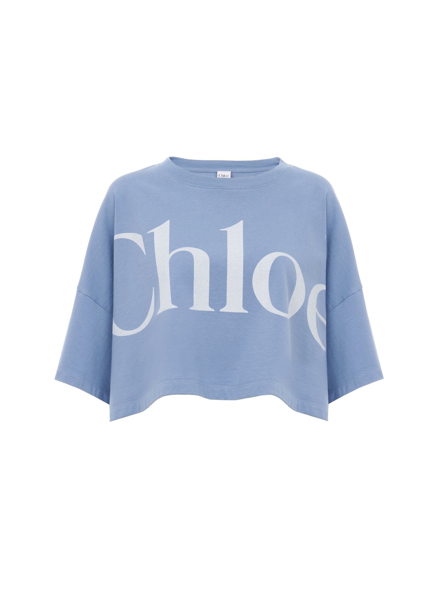 Cropped boxy T-shirt in cotton jersey with a contrast Chloe logo print. PRODUCT DETAILS Cropped T-shirt outer shell: 100% Cotton Fit: oversized, cropped - The model is 5'10" (178 cm) and wears a prototype in size S - Logo T-shirt - Slips on Color: Airy Blue Item code: CH25AJH0918340Q