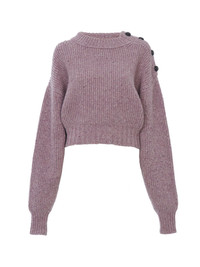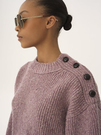 Cropped mock-neck sweater in Donegal wool, featuring shiny leather buttons at the left shoulder and ribbed trims. PRODUCT DETAILS Mock-neck sweater outer shell: 100% Merino wool Buttons: 80% Cowhide, 15% Paperboard, 5% Zamak Fit: straight - The model is 5'10" (178 cm) and wears a prototype in size S - Cropped knit sweater - Shiny leather buttons at left shoulder Color: Dreamy Rose Item code: CH25WMP116406R5