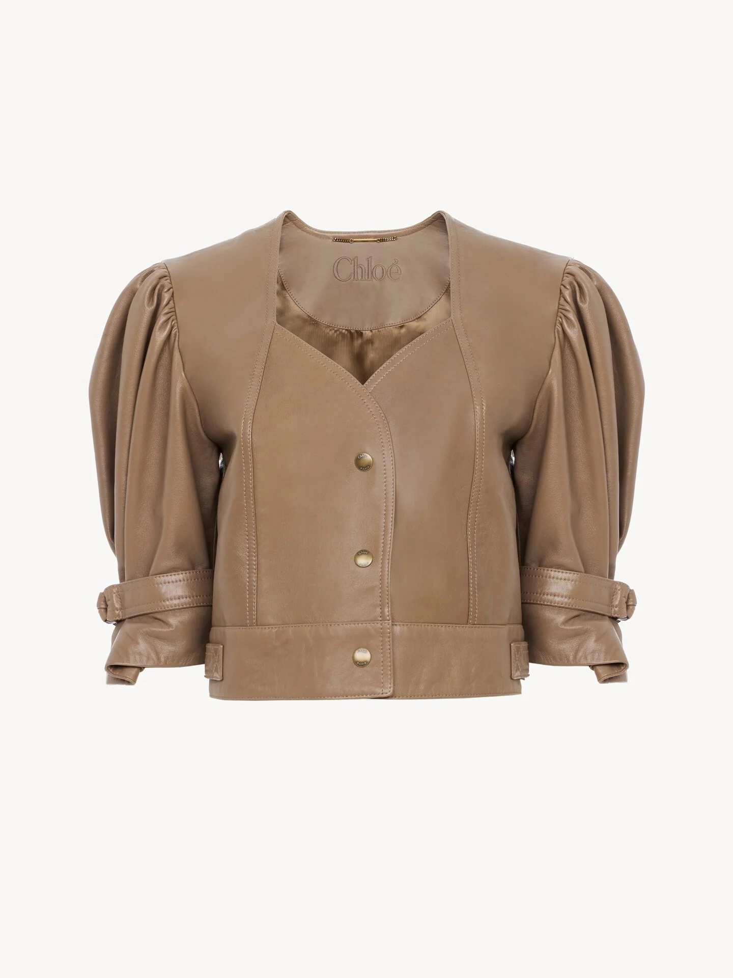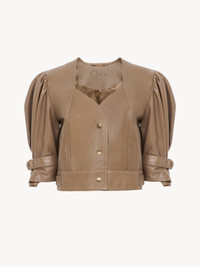 DESCRIPTION Cropped puff-sleeve jacket in slouch lambskin, featuring a curved neckline, snap buttons, cuff tabs and back waist tabs. PRODUCT DETAILS Leather jacket outer shell: 100% Lambskin Lining: 100% Cupro Fit: cropped - The model is 5'10" (178 cm) and wears a prototype in size 36 - Cropped jacket - Snap buttons - Cuff & back waist tabs To make this product, Chloe worked with Leather Working Group (LWG) certified leather manufacturers. LWG certifies tanneries based on their water and energy usage, management of chemicals, solid waste, and wastewater. Color: Smoked Brown Item code: CH26UCV1320020U CARE INSTRUCTIONS To preserve the integrity of your garment, please refrain from washing, entrusting its care to professional cleaning services for optimal maintenance. This garment cannot withstand any bleaching agent. To maintain its shape, refrain from ironing this garment. To best preserve its texture and form, do not dry clean this garment. To best preserve its form and texture, please do not tumble dry this garment. To maintain its delicate nature, do not wet clean this garment. TRACEABILITY Better traceability is central to improving our materials as well as social and environmental practices. Dyeing: Italy Finishing: Italy Tanning: Italy