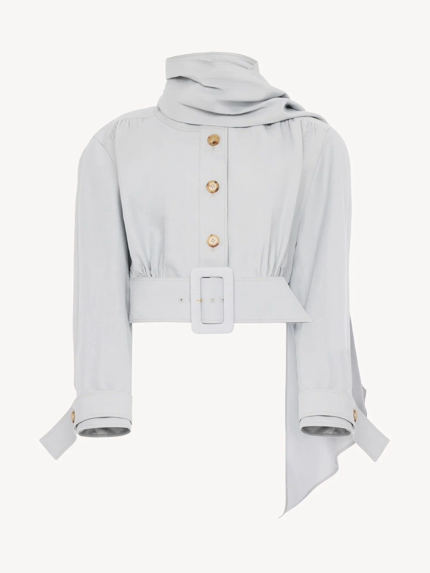 DESCRIPTION Cropped scarf jacket in a slubbed linen-organic cotton mix, featuring horn buttons, a buckled belt and cuff tabs. PRODUCT DETAILS Scarf jacket outer shell: 52% Linen, 48% Cotton Lining: 51% Viscose, 49% Cotton Buttons: 100% Water buffalo horn Fit: cropped - The model is 5'10" (178 cm) and wears a prototype in size 36 - Cropped jacket - Horn buttons - Self-fabric belt - Removable scarf An organic cotton farming system sustains the health of soils, ecosystems and people by eliminating the use of toxic and persistent organic pollutants and increasing water conservation. Color: Storm Grey Item code: CCH26UVE1014301M CARE INSTRUCTIONS To preserve the integrity of your garment, please refrain from washing, entrusting its care to professional cleaning services for optimal maintenance. This garment cannot withstand any bleaching agent. Entrust this garment to a specialist for cleaning with tetrachloroethylene and solvent F, ensuring its delicate nature is maintained with the most care. To maintain its shape, gently iron this garment at a maximum sole plate temperature of 110°C, taking care to avoid any harsh pressure while ironing. To best preserve its form and texture, please do not tumble dry this garment. To maintain its delicate nature, do not wet clean this garment. TRACEABILITY Better traceability is central to improving our materials as well as social and environmental practices. Dyeing: Italy Finishing: Italy Weaving: Italy