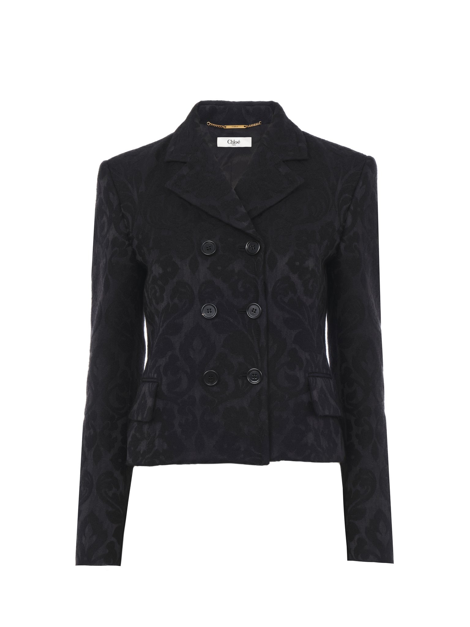 Double-breasted fitted jacket in an ornamental wool-mix jacquard with engraved horn buttons and flap pockets. PRODUCT DETAILS Double-breasted fitted jacket outer shell: 77% Wool, 23% Polyester Lining: 51% Viscose, 49% Cotton Buttons: 100% Water buffalo horn Fit: fitted - The model is 5'10" (178 cm) and wears a prototype in size 36 - Fitted wool jacket - Engraved horn buttons at front & cuffs - Front flap pockets Color: Black Item code: CH25WVE70308001