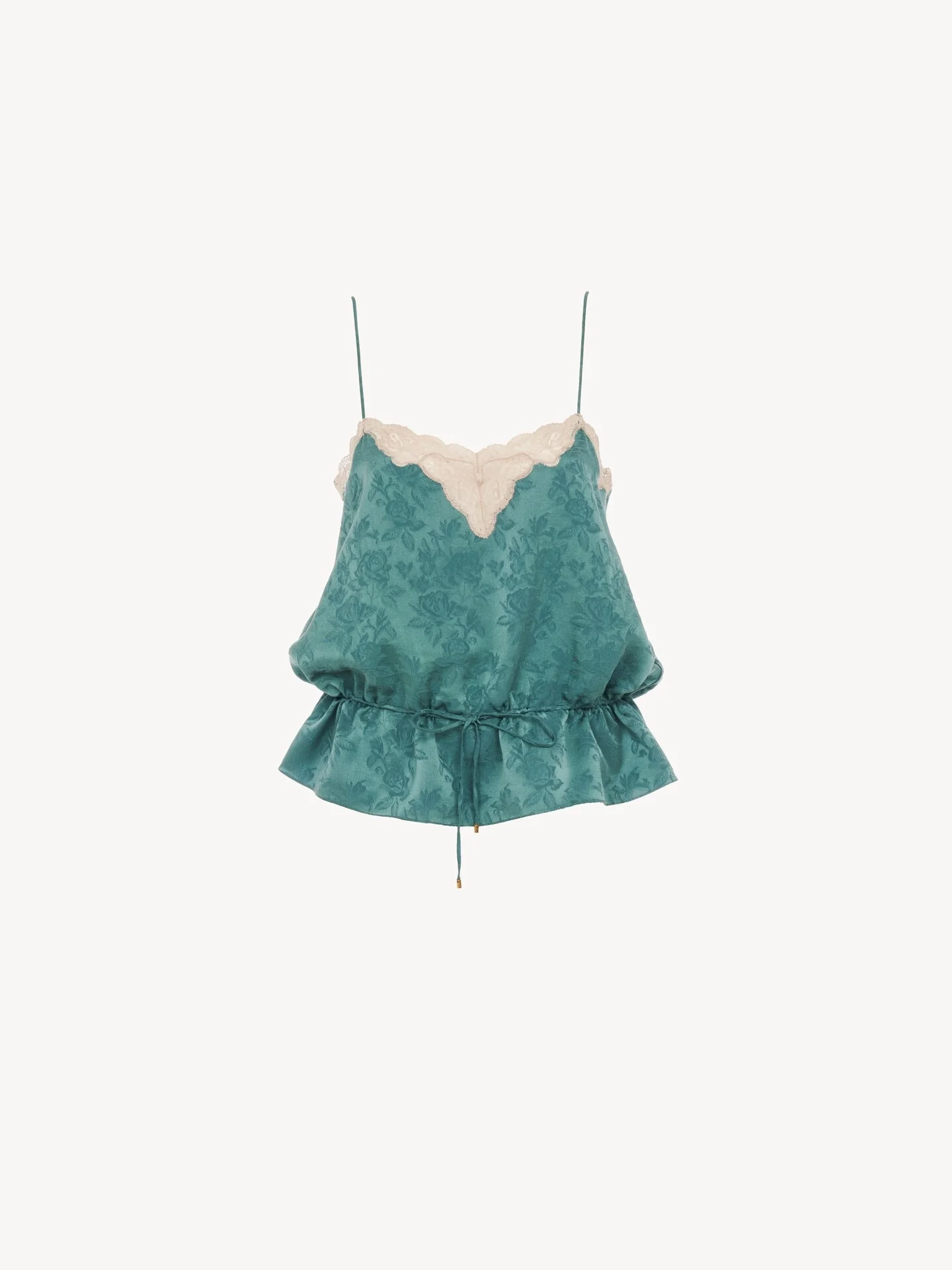 DESCRIPTION Thin-strap camisole top in organic silk with a roses jacquard pattern, featuring lace trims and a drawstring waist finished with gold-tone metal tips. PRODUCT DETAILS Camisole top outer shell: 100% Silk Main lacework: 100% Polyamide Secondary lacework: 90% Cotton, 10% Polyamide Fit: fluid - The model is 5'10" (178 cm) and wears a prototype in size 36 - Sleeveless silk top - Drawstring waist with hammered metal tips Organic silk manufacturing restricts the use of pesticides, insecticides or harsh chemicals and incorporates methods that respect biodiversity, improve soil quality and reduce water consumption. Color: Nearly Green Item code: CH25WHT36323316 CARE INSTRUCTIONS To preserve the integrity of your garment, please refrain from washing, entrusting its care to professional cleaning services for optimal maintenance. TRACEABILITY Better traceability is central to improving our materials as well as social and environmental practices. Dyeing: Italy Finishing: Italy Manufacturing : Italy