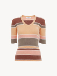 Scoop-neck, elbow-sleeve fitted top in a striped rib knit, signed by subtle Chloe logo embroidery at the chest. PRODUCT DETAILS Fitted top outer shell: 100% Cotton Fit: fitted - The model is 5'10" (178 cm) and wears a prototype in size S - Striped knit top - Slips on Color: Orange Multicolor Item code: CH25AMP386608ZA
