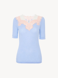 DESCRIPTION Elbow-sleeve fitted sweater in a lower-impact wool rib knit, featuring contrast guipure trims at the neckline. PRODUCT DETAILS Fitted sweater outer shell: 100% Wool Lacework: 100% Polyester Embroidery thread: 100% Polyester Embroidery base: 100% Polyamide Fit: fitted - The model is 5'10" (178 cm) and wears a prototype in size S - Short-sleeve knit top - Slips on The wool used in this product comes from a farm that respects animal welfare, maintains soil health, protects biodiversity and promotes native species. Color: Baltic Sea Item code: CH26UMP34665459 CARE INSTRUCTIONS To preserve the integrity of your garment, please refrain from washing, entrusting its care to professional cleaning services for optimal maintenance. This garment cannot withstand any bleaching agent. To maintain its shape, gently iron this garment at a maximum sole plate temperature of 110°C, taking care to avoid any harsh pressure while ironing. Entrust this garment to a specialist for mild cleaning with tetrachloroethylene and solvent F, ensuring its delicate nature is maintained with the most care. To best preserve its form and texture, please do not tumble dry this garment. To maintain its delicate nature, do not wet clean this garment. TRACEABILITY Better traceability is central to improving our materials as well as social and environmental practices. Dyeing: Italy