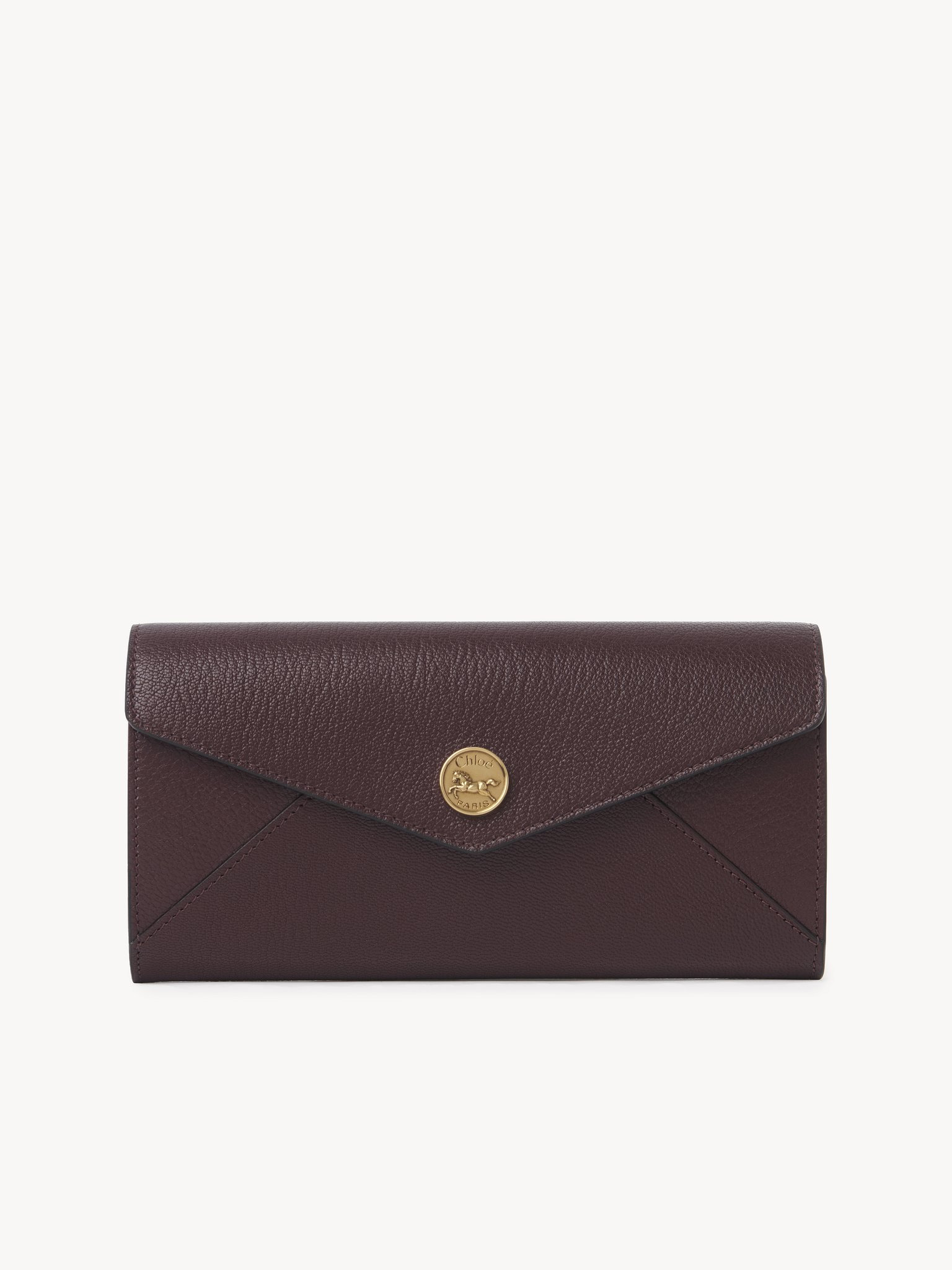 Crafted from grained goatskin, this Envelope long wallet with flap features two main compartments, 12 card slots and a zipped outer pocket. The slim, elongated design is finished with the Maison's golden Horse Medal in a nod to the equestrian world. PRODUCT DETAILS Envelope long wallet with flap in grained goatskin Main lining: Calfskin Inner lining: 65% Polyester, 35% Cotton - 1 flap with snap button closure - 2 main compartments - 12 card slots - 1 flat pocket - 1 zipped outer pocket Comes with a dust bag - Width: 7.9" (20 cm) - Height: 4.7" (12 cm) To make this product, Chloe worked with Leather Working Group (LWG) certified leather manufacturers. LWG certifies tanneries based on their water and energy usage, management of chemicals, solid waste, and wastewater. Color: Grenat Item code: CH25SP540O93602