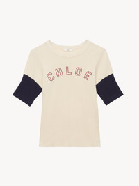 Fitted T-shirt in heavy flame cotton wool with a crew neck, a varsity-inspired Chloe logo and contrast sleeves. PRODUCT DETAILS Fitted T-shirt outer shell: 85% Cotton, 15% Wool Collar: 54% Cotton, 46% Viscose Fit: fitted - The model is 5'10" (178 cm) and wears a prototype in size S - Chloe T-shirt - Slips on Color: Iconic Milk Item code: CH25AJH01174107