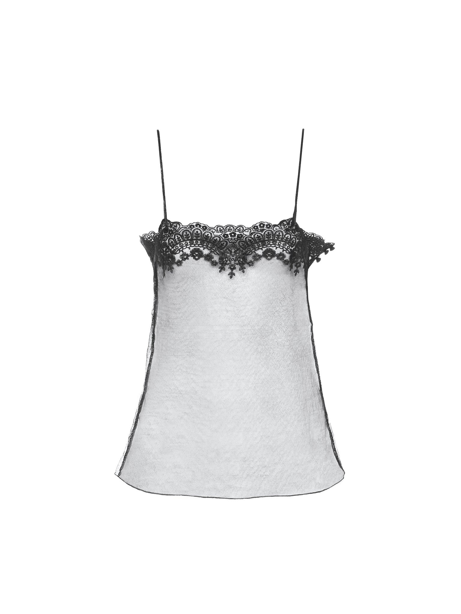 Fitted tank top in a sheer viscose mix with thin straps, embroidered lace and fabric-covered buttons at the side. PRODUCT DETAILS Fitted tank top outer shell: 80% Viscose, 20% Polyamide Lacework: 70% Polyester, 24% Viscose, 6% Polyamide Fit: fitted - The model is 5'10" (178 cm) and wears a prototype in size 36 - Lace-trimmed tank top - Fabric-covered buttons at the side Care: dry cleaning only Color: Black Item code: CH25UHT66099001