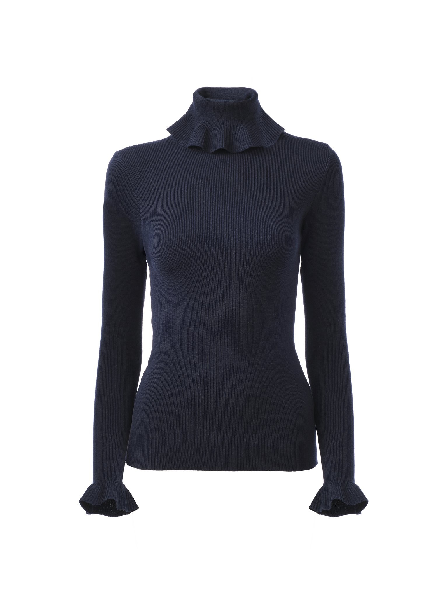 Fitted turtleneck sweater in a cotton and wool knit with frilled detail at the neck and cuffs, signed with a gold-tone Chloe logo plate at the back. PRODUCT DETAILS Turtleneck sweater outer shell: 50% Cotton, 50% Wool Fit: fitted - The model is 5'10" (178 cm) and wears a prototype in size S - Fitted sweater - Slips on Color: Navy Item code: CH25AMP145204C4