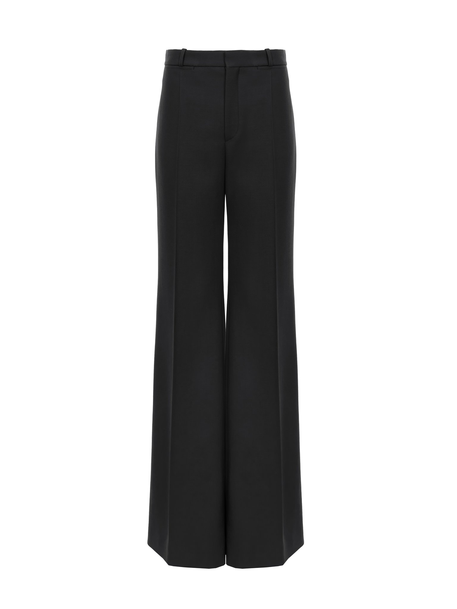 Flared tailored pants in lower-impact wool grain de poudre with pressed creases. PRODUCT DETAILS Flared tailored pants outer shell: 100% Wool Pocket lining: 51% Viscose, 49% Cotton Fit: flared, tailored - The model is 5'10" (178 cm) and wears a prototype in size 36 - Flared wool pants - Front hook & zipper fastening - Engraved button - Front pockets - Belt loops Care: dry cleaning only The wool used in this product comes from a farm that respects animal welfare, maintains soil health, protects biodiversity and promotes native species. Color: Black Item code: CH25SPA06299001