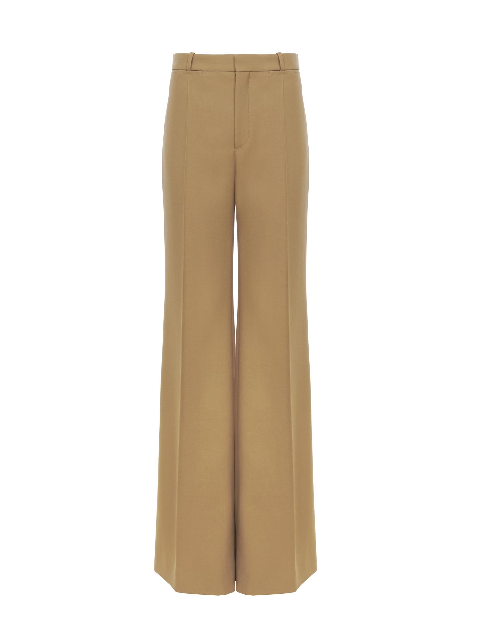Flared tailored pants in lower-impact wool grain de poudre with pressed creases. PRODUCT DETAILS Flared tailored pants outer shell: 100% Wool Pocket lining: 51% Viscose, 49% Cotton Fit: flared, tailored - The model is 5'10" (178 cm) and wears a prototype in size 36 - Flared wool pants - Front hook & zipper fastening - Engraved button - Front pockets - Belt loops Care: dry cleaning only The wool used in this product comes from a farm that respects animal welfare, maintains soil health, protects biodiversity and promotes native species. Color: Nut Item code: CH25SPA0629920C