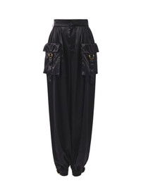 Fluid cargo pants in silk satin, featuring oversized flap pockets at the front. Gold-tone D-rings detail the pockets and tapered cuff tabs. PRODUCT DETAILS Fluid cargo pants outer shell: 100% Silk Buttons: 100% Water buffalo horn Fit: fluid - The model is 5'10" (178 cm) and wears a prototype in size 36 - Black silk pants - Front zipper & hook fastening - Oversized front flap pockets with D-ring buckles - Cuff tabs with D-ring buckles - Belt loops Color: Black Item code: CH25APA19132001