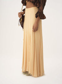Gathered fluid maxi skirt in organic silk mousseline with a silk-mix lining, detailed with flounces. PRODUCT DETAILS Fluid maxi skirt outer shell: 100% Silk Lining: 68% Acetate fiber, 32% Silk Fit: fluid - The model is 5'10" (178 cm) and wears a prototype in size 36 - Long silk skirt - Back zipper Organic silk manufacturing restricts the use of pesticides, insecticides or harsh chemicals and incorporates methods that respect biodiversity, improve soil quality and reduce water consumption. This product was made in collaboration with Akanjo, a certified WFTO supplier. Akanjo is a social enterprise located in Madagascar that places equal pay and employees' health & wellbeing at the core of their priorities. A long-standing partner of Chloe for 15 years, Akanjo is also committed to training and promoting craftsmanship. Color: Delicate Pink Item code: CH25WJU200016H6