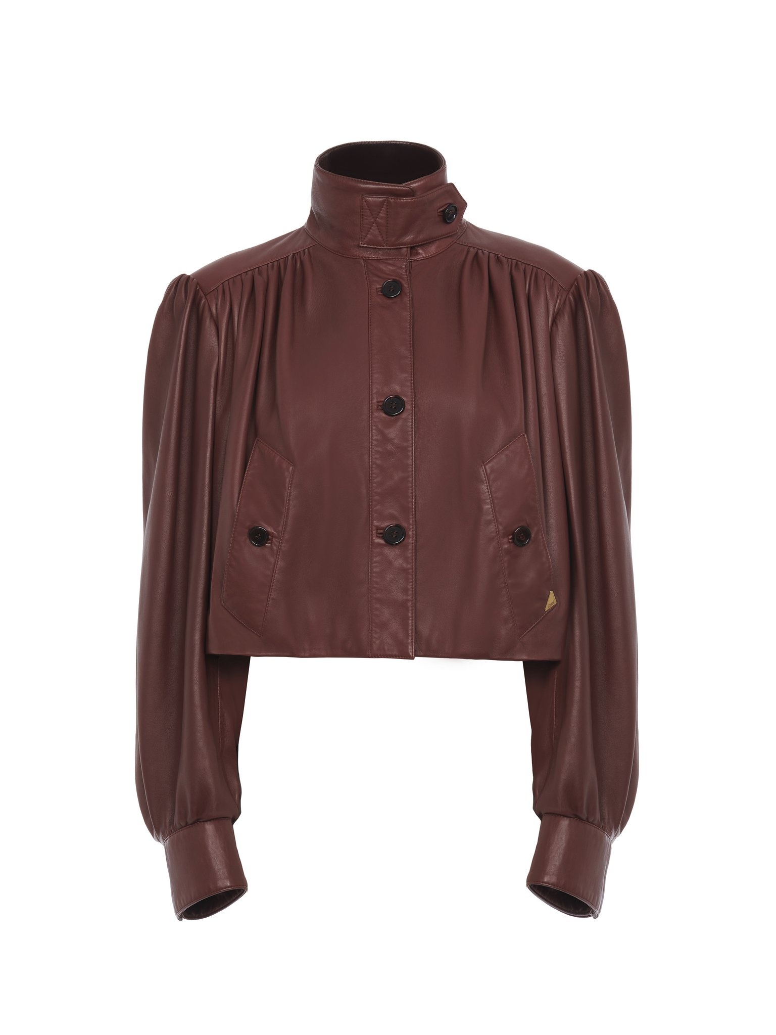 Gathered boule jacket in plonge nappa leather with a high neck, gathered shoulders and pleated sleeves. Engraved horn buttons and a gold metal Chloe logo triangle at the left pocket finish this piece. PRODUCT DETAILS Gathered boule jacket outer shell: 100% Lambskin Main lining: 62% Viscose, 38% Cotton Pocket lining: 51% Viscose, 49% Cotton Fit: gathered - The model is 5'10" (178 cm) and wears a prototype in size 36 - Pleated-sleeve leather jacket - Engraved horn buttons through front, at collar, side pockets & cuffs - Side pockets - Gold metal Chloe logo triangle at left pocket Care: leather specialist only Color: Faded Mahogany Item code: CH25UCV1120527N