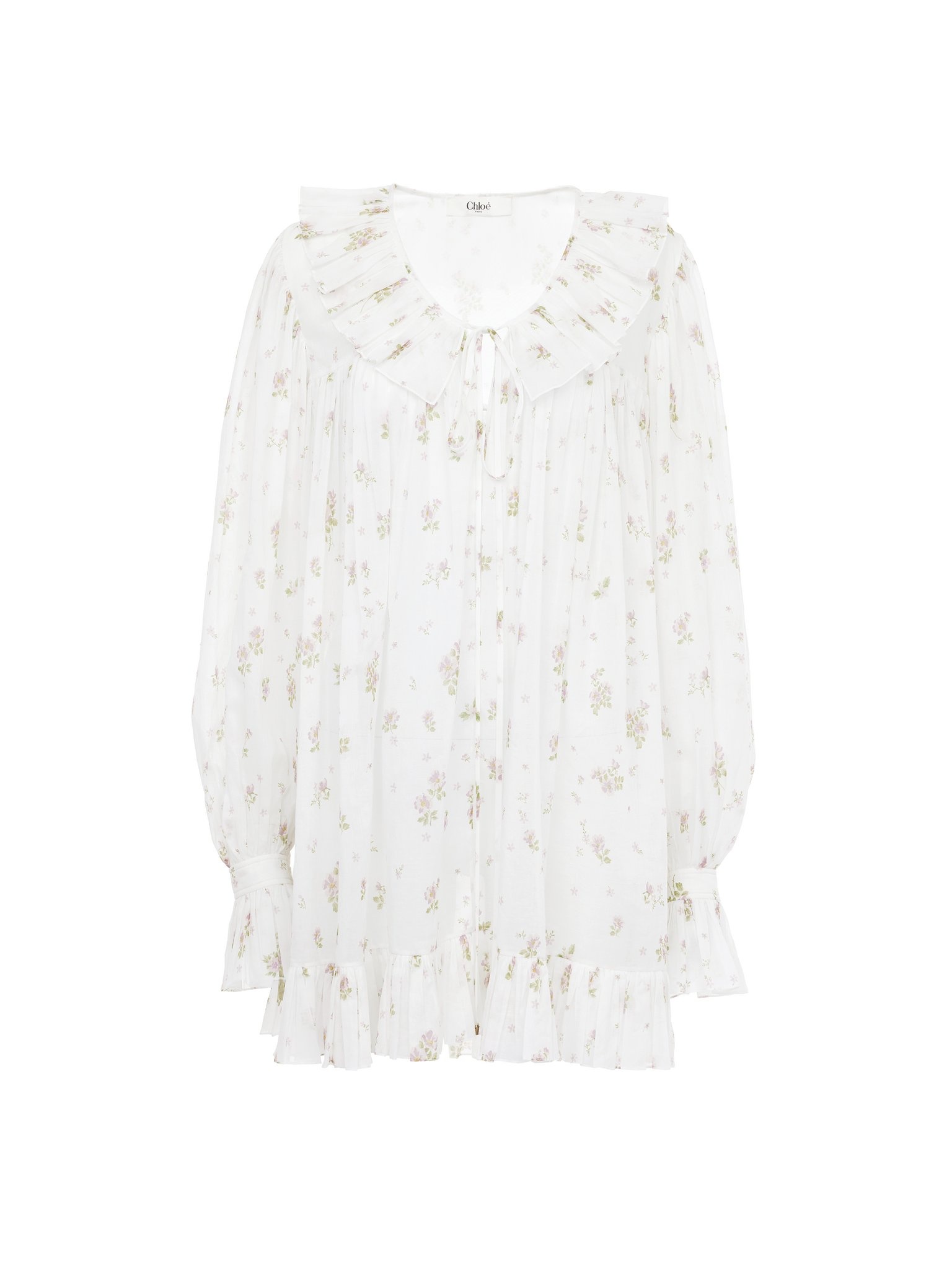 Gathered long-sleeve mini dress in cotton voile with a floral Liberty print and a silk-mix lining, featuring ruffle trims at the V-neck collar, cuffs and hem. Dangling ties are finished with gold-tone metal tips. PRODUCT DETAILS Gathered long-sleeve mini dress outer shell: 100% Cotton Lining: 68% Acetate fiber, 32% Silk Buttons: 100% Mother-of-pearl Fit: fluid, mini length - The model is 5'10" (178 cm) and wears a prototype in size 36 - Printed cotton mini dress - Mother-of-pearl buttons at cuffs - Tie fastening at neck with hammered metal tips This product was made in collaboration with Akanjo, a certified WFTO supplier. Akanjo is a social enterprise located in Madagascar that places equal pay and employees' health & wellbeing at the core of their priorities. A long-standing partner of Chloe for 15 years, Akanjo is also committed to training and promoting craftsmanship. Color: Iconic Milk Item code: CH25ARO26896107
