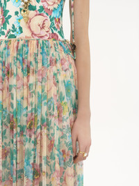 Gathered maxi skirt in organic silk mousseline with a floral print inspired by the Maison's heritage. The fluid, tiered silhouette includes a silk-mix lining, while a dangling side tie with hammered metal tips finishes this piece. PRODUCT DETAILS Gathered maxi skirt outer shell: 100% Silk Lining: 68% Acetate fiber, 32% Silk Fit: fluid, maxi length - The model is 5'10" (178 cm) and wears a prototype in size 36 - Long printed silk skirt - Left-side hook & zipper fastening - Side waist tie with hammered metal tips Care: dry cleaning only Organic silk manufacturing restricts the use of pesticides, insecticides or harsh chemicals and incorporates methods that respect biodiversity, improve soil quality and reduce water consumption. This product was made in collaboration with Akanjo, a certified WFTO supplier. Akanjo is a social enterprise located in Madagascar that places equal pay and employees' health & wellbeing at the core of their priorities. A long-standing partner of Chloe for 15 years, Akanjo is also committed to training and promoting craftsmanship. Color: Seedpearl Beige Item code: CH25UJU1046524T