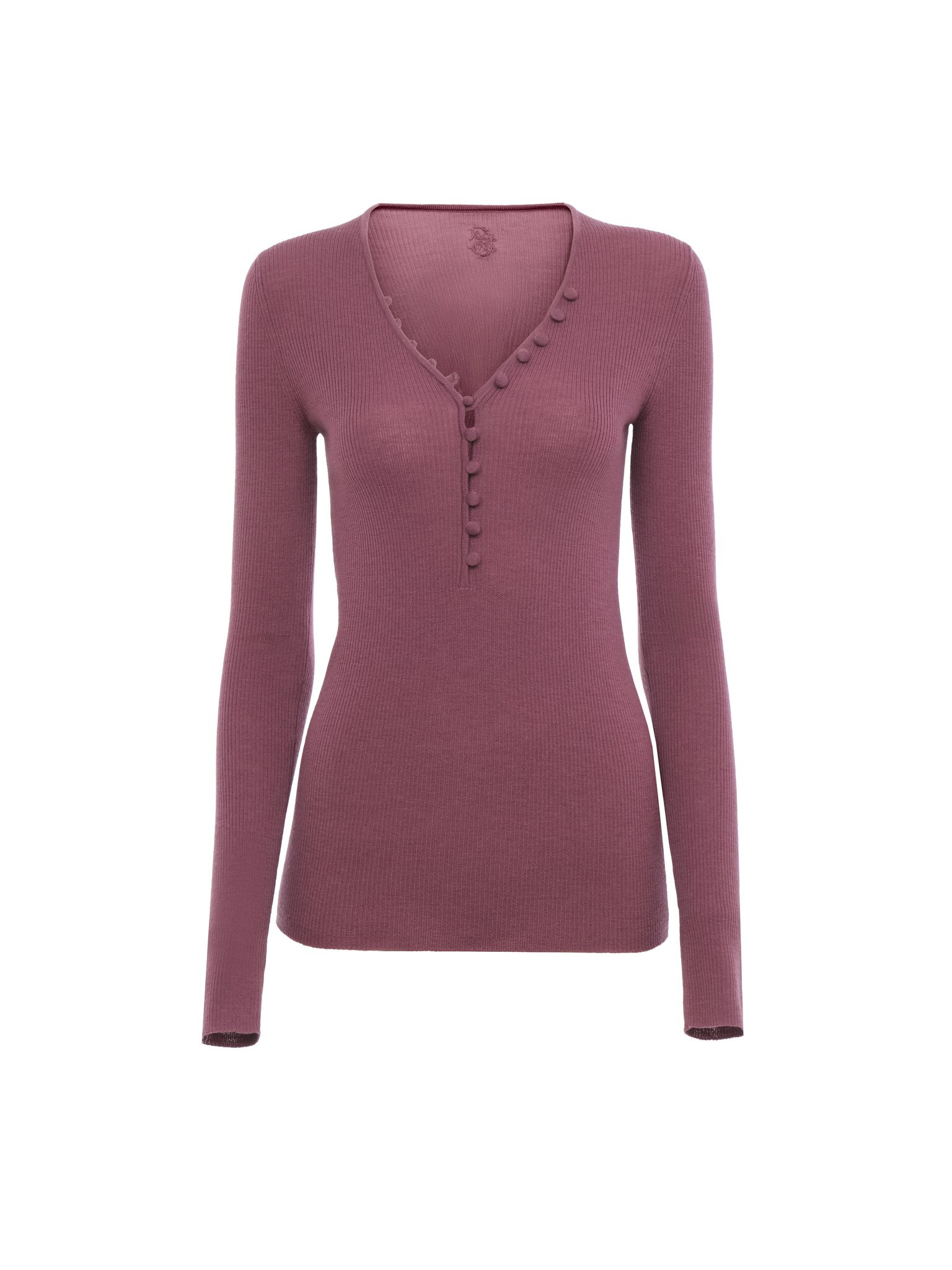 Fitted V-neck Henley shirt in a lower-impact merino wool knit, featuring fabric-covered buttons and baroque "C" embroidery at the back. PRODUCT DETAILS Henley shirt outer shell: 100% Merino wool Fit: fitted - The model is 5'10" (178 cm) and wears a prototype in size 36 - Fitted long-sleeve top - Fabric-covered buttons at front The wool used in this product comes from a farm that respects animal welfare, maintains soil health, protects biodiversity and promotes native species. Color: Rusty Pink Item code: CH25WMP055306AC