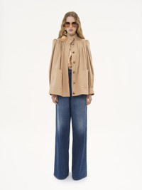 High-neck gathered jacket in light organic cotton gabardine, featuring gathered shoulders, engraved horn buttons and patch pockets. PRODUCT DETAILS Gathered jacket outer shell: 100% Cotton Buttons: 100% Horn Fit: straight - The model is 5'10" (178 cm) and wears a prototype in size 36 - Gathered cotton jacket - Engraved horn buttons through front & at cuffs - 2 front patch pockets - Gold metal Chloe logo triangle at left pocket Care: dry cleaning only An organic cotton farming system sustains the health of soils, ecosystems and people by eliminating the use of toxic and persistent organic pollutants and increasing water conservation. Color: Soft Tan Item code: CH25UVE20118275