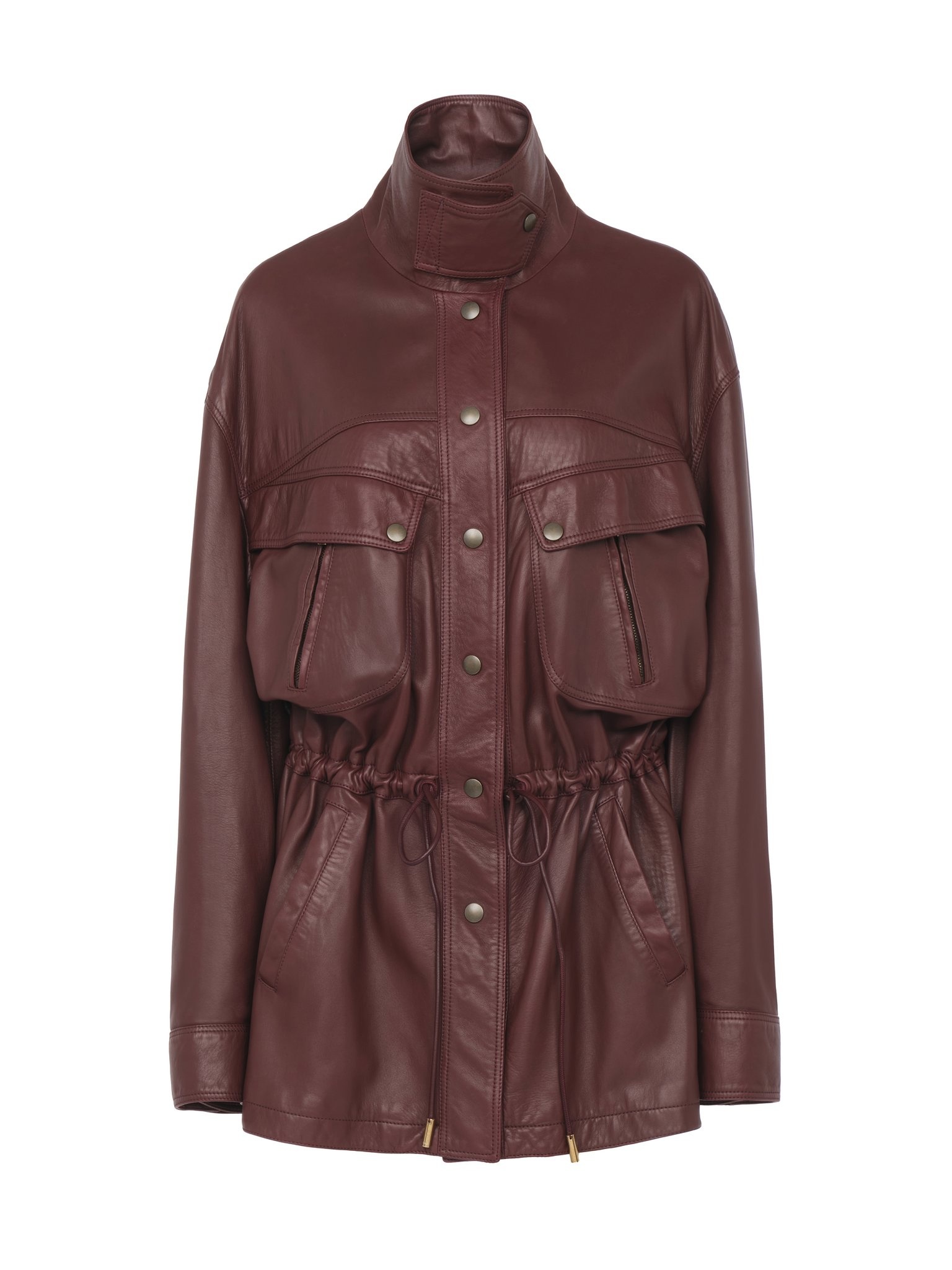 High-neck parka in classic plonge leather, featuring a chin-strap collar, oversized pockets, an elasticated drawstring waist and gold-tone snap buttons. PRODUCT DETAILS High-neck parka outer shell: 100% Lambskin Main lining: 62% Viscose, 38% Cotton Pocket lining: 100% Cotton Fit: straight - The model is 5'10" (178 cm) and wears a prototype in size 36 - Leather parka - Snap buttons through front, at chin-strap collar & pockets - Elasticated drawstring waist - Oversized chest flap pockets with zippers - Side pockets To make this product, Chloe worked with Leather Working Group (LWG) certified leather manufacturers. LWG certifies tanneries based on their water and energy usage, management of chemicals, solid waste, and wastewater. Color: Dusky Brown Item code: CH25ACM0421125D