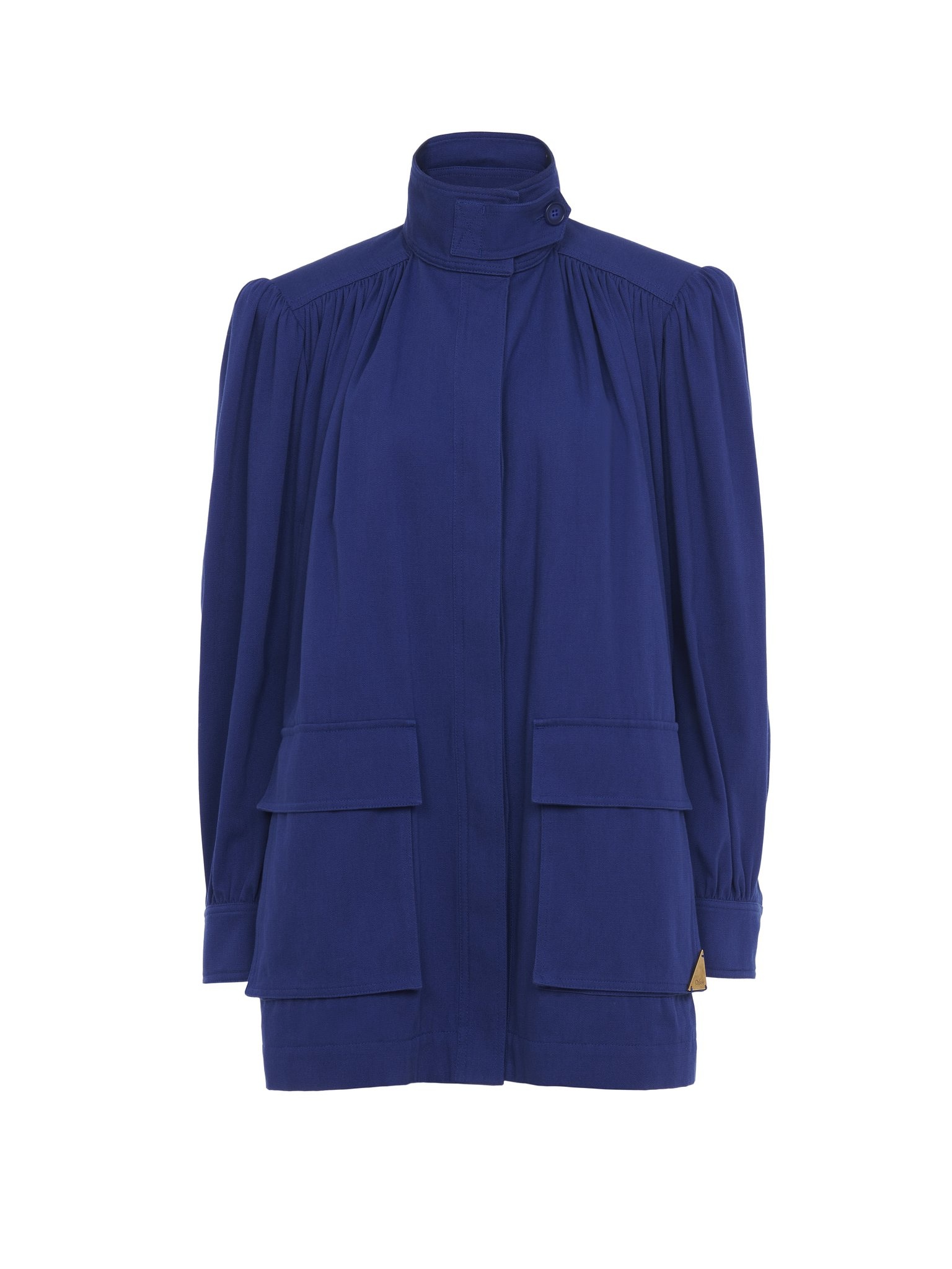 Gathered high-neck utilitarian jacket in cotton canvas, featuring puff sleeves, maxi flap pockets and engraved horn buttons. A gold-tone logo triangle signs the left pocket. PRODUCT DETAILS Utilitarian jacket outer shell: 100% Cotton Lining: 100% Cotton Buttons: 100% Horn Fit: straight - The model is 5'10" (178 cm) and wears a prototype in size 40 - High-neck cotton jacket - Engraved horn buttons through front & at cuffs - 2 maxi front flap pockets with top & side entry - Gold metal Chloe logo triangle at left pocket Care: dry cleaning only Color: Fresh Indigo Item code: CH25UVE220024C8