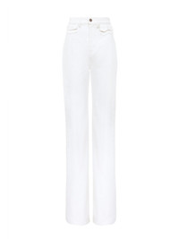High-rise flare jeans in organic cotton denim with mini flap pockets at the waist. PRODUCT DETAILS High-rise flare jeans outer shell: 100% Cotton Patch: 100% Calfskin Fit: flared, high waist - The model is 5'10" (178 cm) and wears a prototype in size 34 - High-rise jeans - Front zipper & Chloe-engraved button fastening - 3 mini flap pockets at waist - Back pockets - Belt loops - Leather Chloe patch at back Care: gentle wash 90°F (30°C) An organic cotton farming system sustains the health of soils, ecosystems and people by eliminating the use of toxic and persistent organic pollutants and increasing water conservation. Color: White Item code: CH25UDP03150101