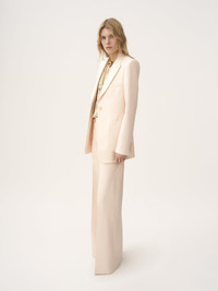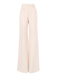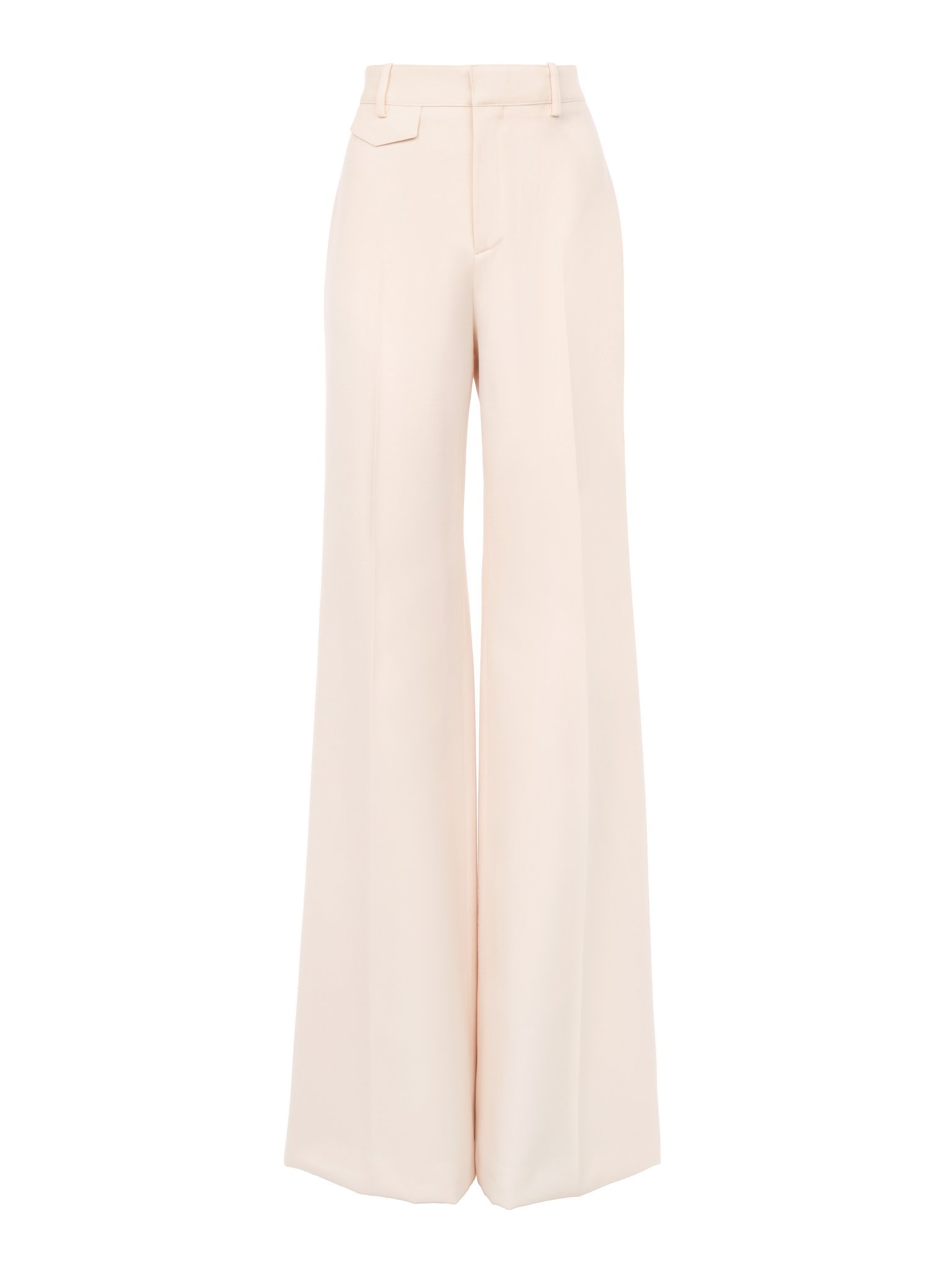 High-rise flared pants in lower-impact light wool gabardine, detailed with a mini flap pocket at the hip. PRODUCT DETAILS High-rise flared pants outer shell: 100% Wool Lining: 100% Silk Buttons: 100% Water buffalo horn Fit: flared - The model is 5'10" (178 cm) and wears a prototype in size 36 - High-waisted pants - Front zipper & hook fastening - Engraved horn button - Mini flap pocket at right hip - Piped back pockets - Belt loops The wool used in this product comes from a farm that respects animal welfare, maintains soil health, protects biodiversity and promotes native species. This piece was created in collaboration with Chize Confection. A long-standing partner of Chloe, Chize Confection is a Societe Cooperative de Production (SCOP). This cooperative model is distinguished by its democratic governance, fostering a collaborative and democratic working environment. Chloe has signed a contract to financially support Chize Confection with projects that will benefit its employees. Color: Biscuit Pink Item code: CH25APA060666H7