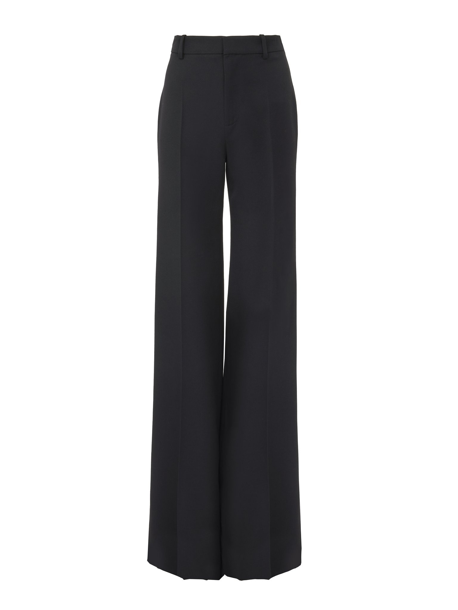 High-rise flared pants in lower-impact wool grain de poudre with pressed front creases. PRODUCT DETAILS High-rise flared pants outer shell: 100% Wool Lining: 100% Silk Buttons: 100% Horn Fit: high-waisted, flared - The model is 5'10" (178 cm) and wears a prototype in size 34 - Tailored wool pants - Front zipper - Engraved horn button - Side pockets - Top-stitched back pockets - Belt loops Care: dry cleaning only The wool used in this product comes from a farm that respects animal welfare, maintains soil health, protects biodiversity and promotes native species. Color: Black Item code: CH25UPA15067001