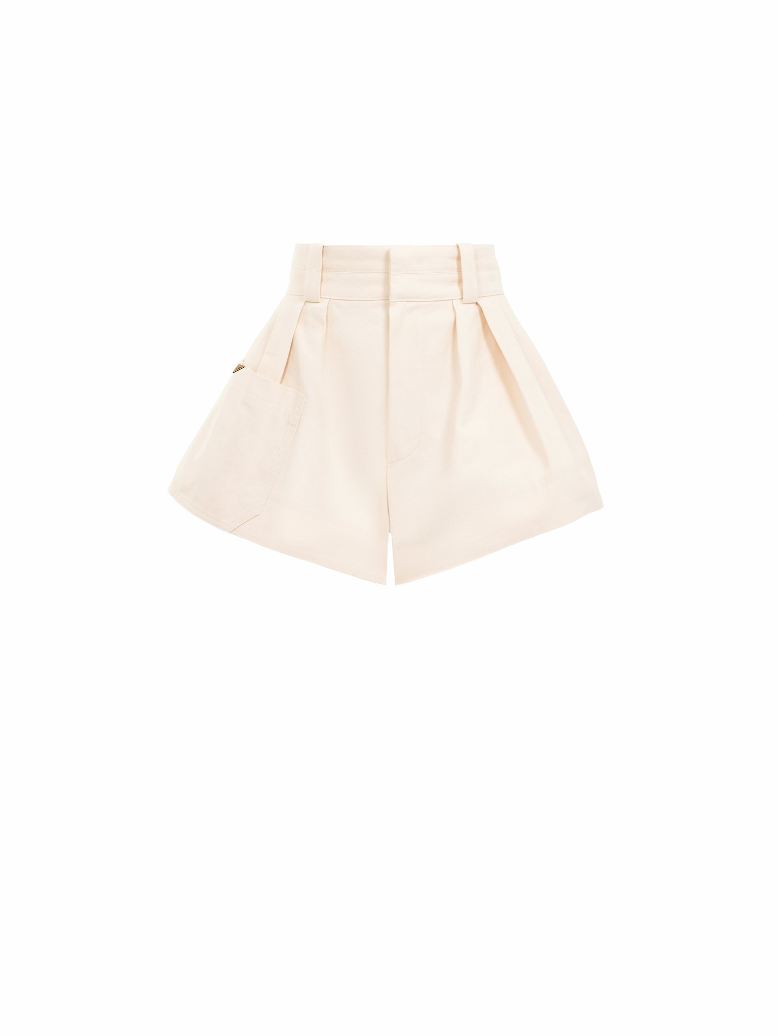 High-rise mini shorts in garment-dyed organic cotton canvas with pleats and an asymmetrical front patch pocket detailed with a gold metal Chloe logo triangle. PRODUCT DETAILS High-rise mini shorts outer shell: 100% Cotton Button: 100% Horn Fit: fluid, mini length - The model is 5'10" (178 cm) and wears a prototype in size 36 - Fluid shorts - Front zipper & horn button - Maxi front patch pocket - Left-side pocket - Single piped back pocket - Gold metal Chloe logo triangle at front pocket Care: dry cleaning only An organic cotton farming system sustains the health of soils, ecosystems and people by eliminating the use of toxic and persistent organic pollutants and increasing water conservation. Color: Timid Pink Item code: CH25USH160406C2