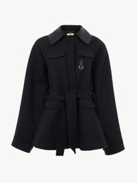 DESCRIPTION Belted hunting jacket in lower-impact houndstooth wool, featuring maxi flap pockets, engraved horn buttons and gold-tone D-rings. PRODUCT DETAILS Hunting jacket outer shell: 100% Virgin wool Lining: 51% Viscose, 49% Cotton Trim: 100% Lambskin Buckle: 50% Calfskin, 50% Zamak Buttons: 100% Water buffalo horn Fit: straight - The model is 5'10" (178 cm) and wears a prototype in size 36 - Black wool jacket - Engraved horn buttons through front & at cuffs - Maxi front flap pockets with top & side entry - Chest flap pockets - Buckled belt - Gold-tone D-rings The wool used in this product comes from a farm that respects animal welfare, maintains soil health, protects biodiversity and promotes native species. Color: Pearly Black Item code: CH25WVE17174010 CARE INSTRUCTIONS To preserve the integrity of your garment, please refrain from washing, entrusting its care to professional cleaning services for optimal maintenance. This garment cannot withstand any bleaching agent. To maintain its shape, gently iron this garment at a maximum sole plate temperature of 110°C, taking care to avoid any harsh pressure while ironing. Entrust this garment to a specialist for mild cleaning with tetrachloroethylene and solvent F, ensuring its delicate nature is maintained with the most care. To maintain its delicate nature, do not wet clean this garment. To best preserve its form and texture, please do not tumble dry this garment. TRACEABILITY Better traceability is central to improving our materials as well as social and environmental practices. Dyeing: Italy Finishing: Italy