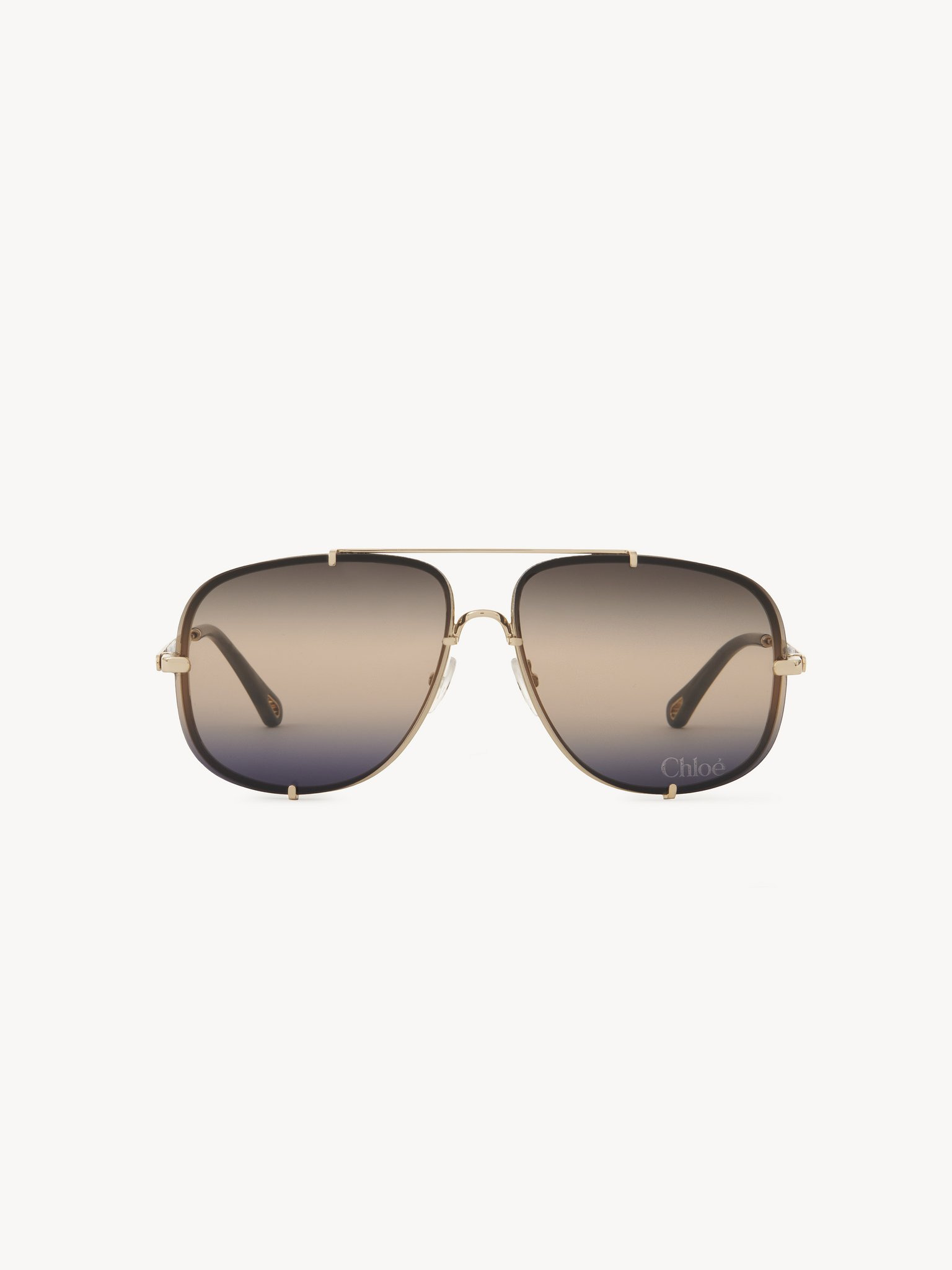 These Ivy aviator sunglasses pair a lightweight frame in shiny light gold metal with triple gradient beige to blue lenses secured by metal hooks. A Chloe logo engraving signs the left lens and temples. Drop-shaped openings at the temple tips make these sunglasses compatible with Chloe's eyewear jewelry. PRODUCT DETAILS Aviator sunglasses in gold metal & bio-based nylon - 100% UVA and UVB protection - Adjustable nose pads - Not prescription friendly - Chloe logo engraved on both temples - Filter category: 1 These sunglasses come with a case and lens cloth - Lens: 2.4" (62 mm) - Bridge: 0.5" (12 mm) - Temple: 5.5" (140 mm) - Gold metal frame - Gradient beige to blue lenses Item code: CH25WEK0348819