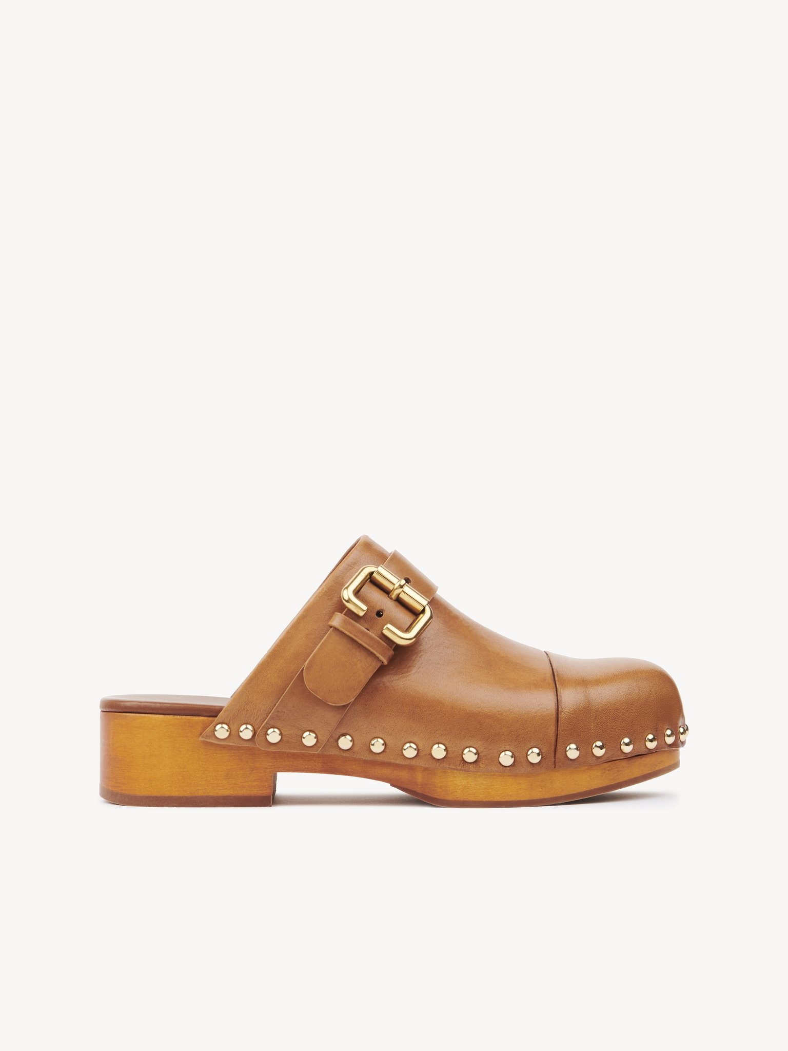 Reinterpreting an iconic Chloe shape, these Jeannette clogs combine a shiny calfskin upper with a low wooden wedge platform for comfortable wear. Gold-tone studs and the Maison's iconic Paddington buckle finish these flat clogs. PRODUCT DETAILS Clog heel height: 1.6" (4 cm) Heel-to-toe drop: 0.4" (1 cm) Upper: calfskin Inner sole: calfskin Main lining: calfskin Sole: TPU Heel: wood Fit true to size, European sizing - Slip-on To make this product, Chloe worked with Leather Working Group (LWG) certified leather manufacturers. LWG certifies tanneries based on their water and energy usage, management of chemicals, solid waste, and wastewater. Color: Ginger Brown Item code: CH25A12ZLT27T