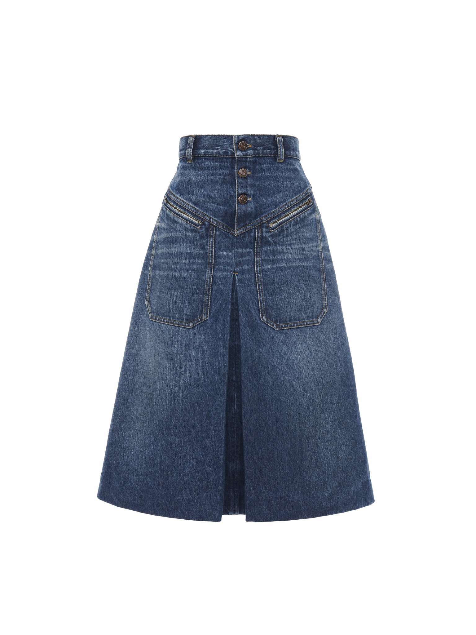 Knee-length skirt in broken blue organic cotton denim with Chloe-engraved buttons, oversized patch pockets with diagonal zippers, and a front box pleat. PRODUCT DETAILS Knee-length skirt outer shell: 100% Cotton Patch: 100% Calfskin Fit: flared, knee length - The model is 5'10" (178 cm) and wears a prototype in size 34 - Chloe denim skirt - Chloe-engraved button fastenings at front - Oversized front patch pockets with zippers - Belt loops - Front box pleat An organic cotton farming system sustains the health of soils, ecosystems and people by eliminating the use of toxic and persistent organic pollutants and increasing water conservation. Color: Hazy Blue Item code: CH25ADJ01251427