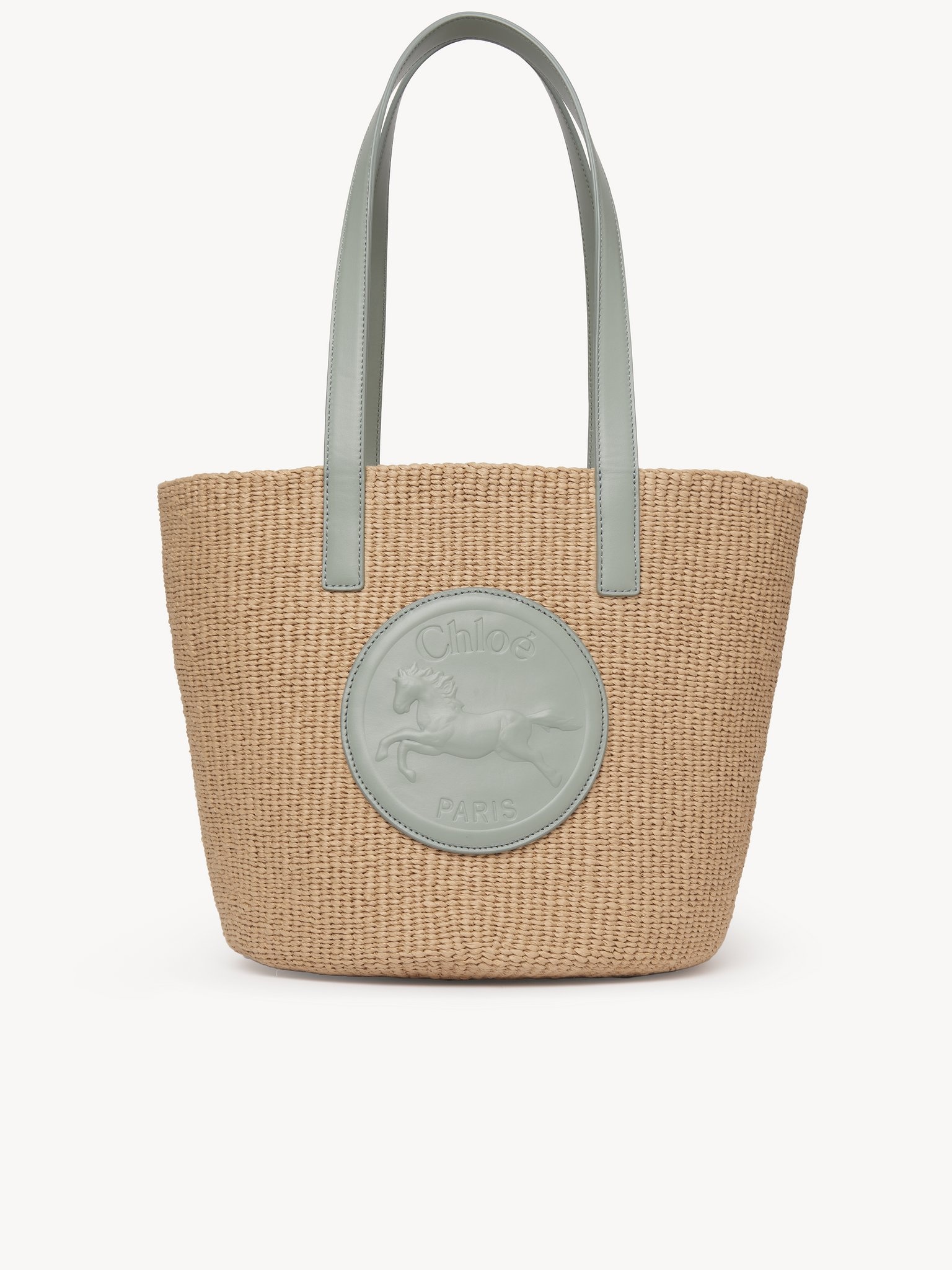 This large Horse Medal basket bag is handwoven from fair-trade paper by independent craftswomen in Kenya. The spacious, rounded compartment is finished with a signature calfskin medal, featuring the Chloe logo and an embossed image of a galloping horse. Carry in the hand or on the shoulder with the double straps. Each basket comes with a leather label signed by the craftsman who made it. PRODUCT DETAILS Large Horse Medal basket bag in fair-trade paper & calfskin Main material: Paper Secondary material: Calfskin Main lining: Paper Carry: Hand & shoulder - 1 main compartment Comes with a dust bag - Width: 7.1" (35 cm) - Height: 7.5" (30 cm) - Depth: 3.1" (25 cm) This model has been handwoven with natural fibers, so the dimensions may slightly vary from one basket to another. - Handle drop: 11" (28 cm) This basket bag is woven from natural fiber in collaboration with Mifuko, which empowers its artisans in Kenya through fair pay and less dependence on unpredictable farming as a source of income. Each basket is a unique handmade piece that weaves together traditional Kenyan handcraft and the story of a strong, independent woman whose signature you will find on the label. Color: Bluish Green Item code: CHC25SS591O8238T