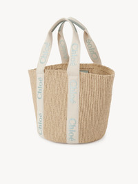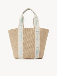This large Woody basket bag is handwoven from fair-trade paper by independent craftswomen in Kenya. It is finished with signature canvas ribbons embroidered with the Chloe logo. Each basket features a leather label signed by the artisan who crafted the bag. Carry yours in your hand or on the shoulder with the double handles. PRODUCT DETAILS Large Woody basket bag in fair-trade paper, calfskin & polyester webbing with Chloe logo embroidery Main material: Paper Secondary material: Calfskin Lining: Paper Trim: Polyester Handle: Polyester webbing Carry: hand & shoulder - 1 spacious main compartment Comes with a dust bag - Width: 13.8" (35 cm) - Height: 11.8" (30 cm) Please note: the height may vary slightly from one basket to another, as each piece is woven by hand. - Depth: 9.8" (25 cm) - Strap drop: 9.1" (23 cm) This basket bag is woven from natural fiber in collaboration with Mifuko, which empowers its artisans in Kenya through fair pay and less dependence on unpredictable farming as a source of income. Each basket is a unique handmade piece that weaves together traditional Kenyan handcraft and the story of a strong, independent woman whose signature you will find on the label. Color: Bluish Green Item code: CHC23AS380L1838T