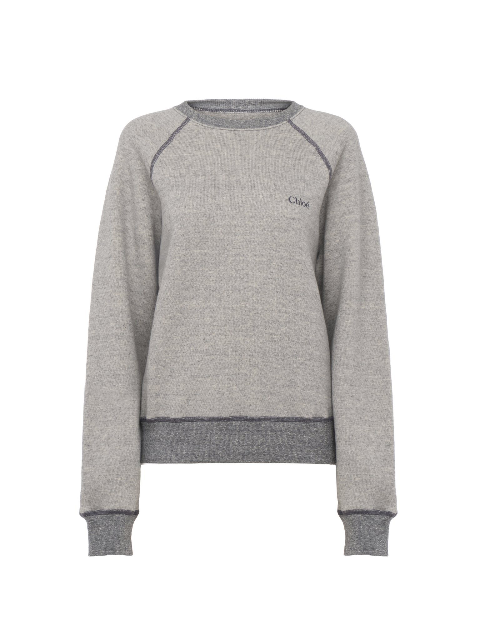 Crew-neck sweater in a chine cotton fleece mix, detailed with contrast ribbed trims and a subtle Chloe logo at the chest. PRODUCT DETAILS Crew-neck sweater outer shell: 85% Cotton, 15% Lyocell Hem & cuffs: 55% Cotton, 42% Lyocell, 3% Elastane Fit: straight - The model is 5'10" (178 cm) and wears a prototype in size S - Chloe logo sweater - Slips on Color: Vapor Grey Item code: CH25AJH21179060